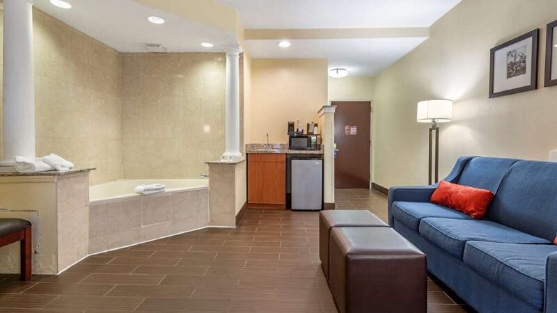 Hotels with Jacuzzi in room in Newark typically provide additional amenities such as spacious suites, comfortable beds, modern bathrooms, complimentary Wi-Fi, flat-screen TVs, and in-room Jacuzzi tubs or whirlpools for relaxation and indulgence.