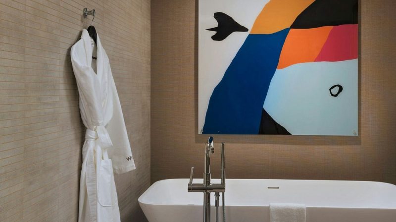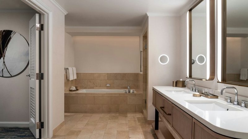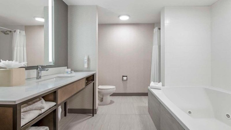 Clean and modern Hilton property with private spa tub, meeting space, fitness center, Wi-Fi, and dining near Addison.