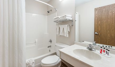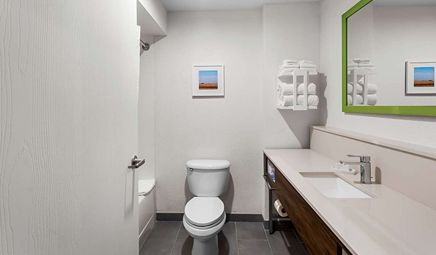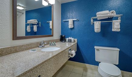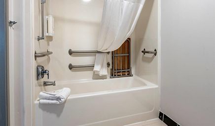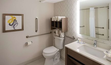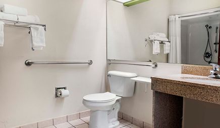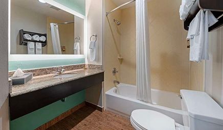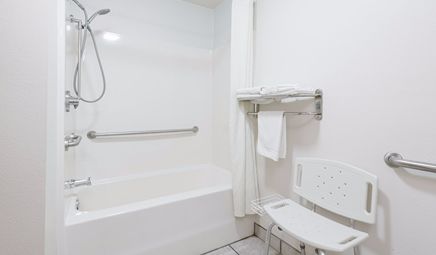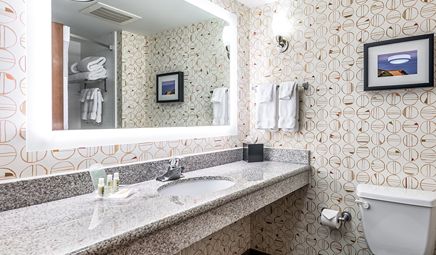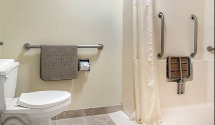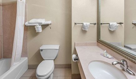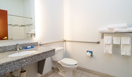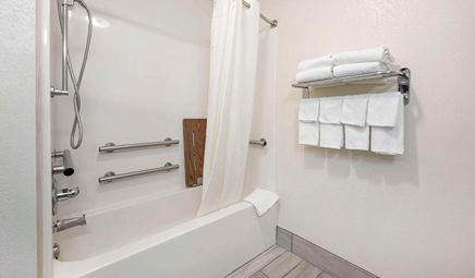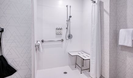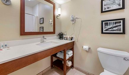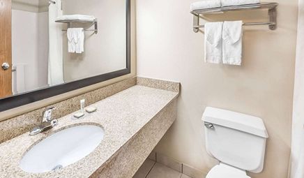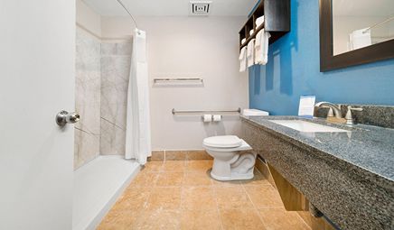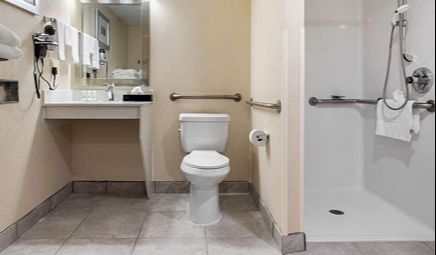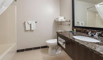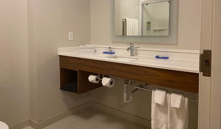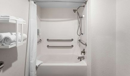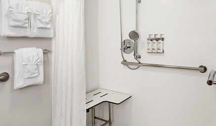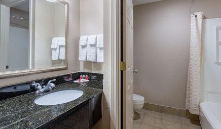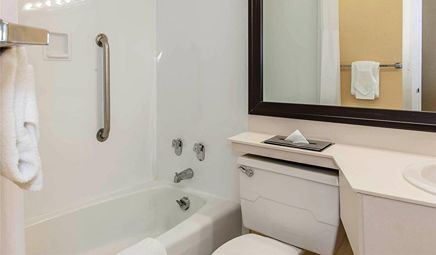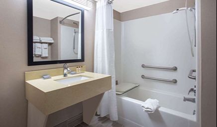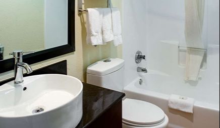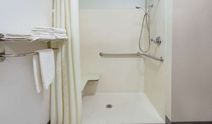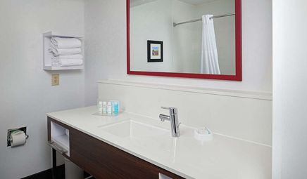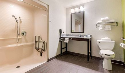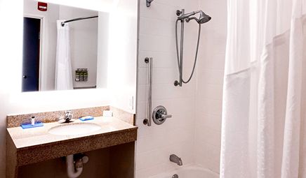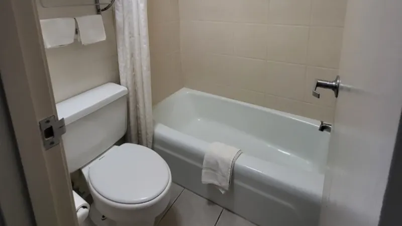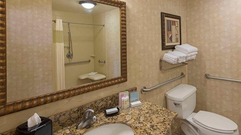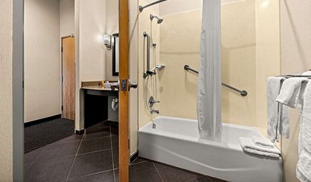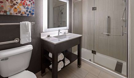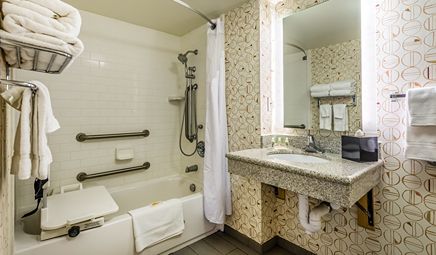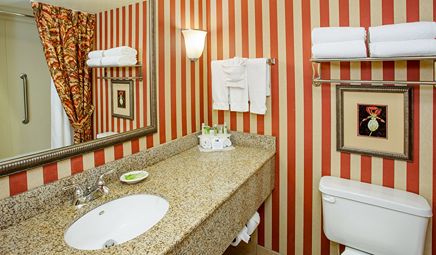 Room wasclean and bathroom was spacious with a nice stand up shower. Four stars due to size. I had a suite and it just felt crammed with furniture.