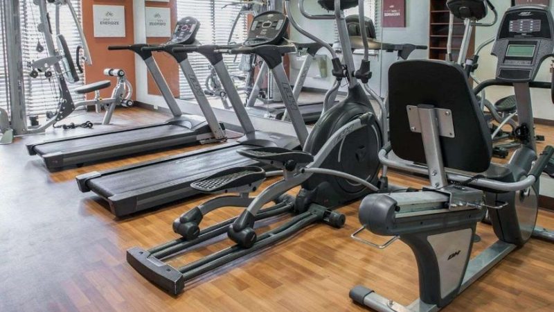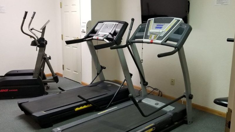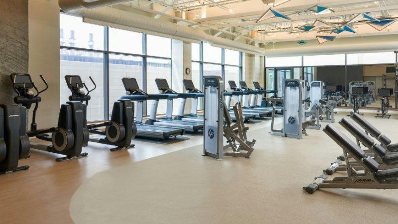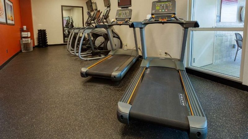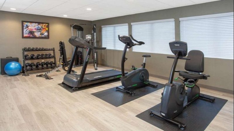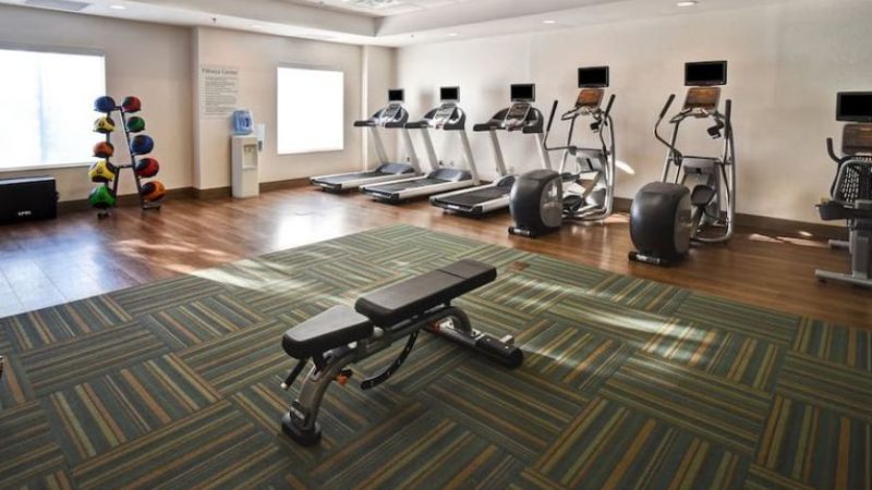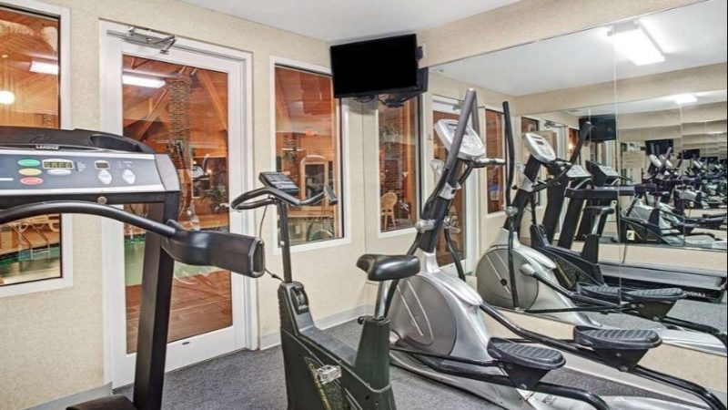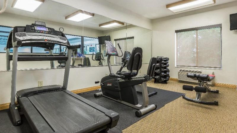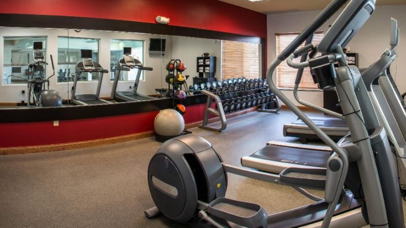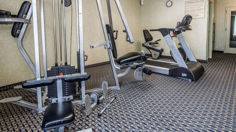 Which hotels with spa tub in room in Indiana have an on-site gym?
