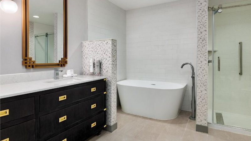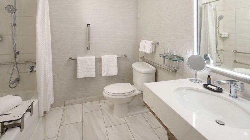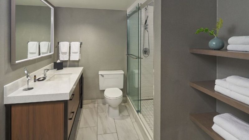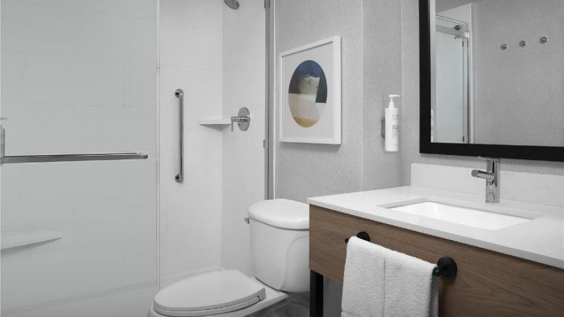 Room wasclean and bathroom was spacious with a nice stand up shower. Four stars due to size. I had a suite and it just felt crammed with furniture.