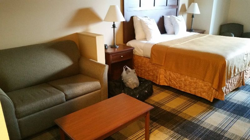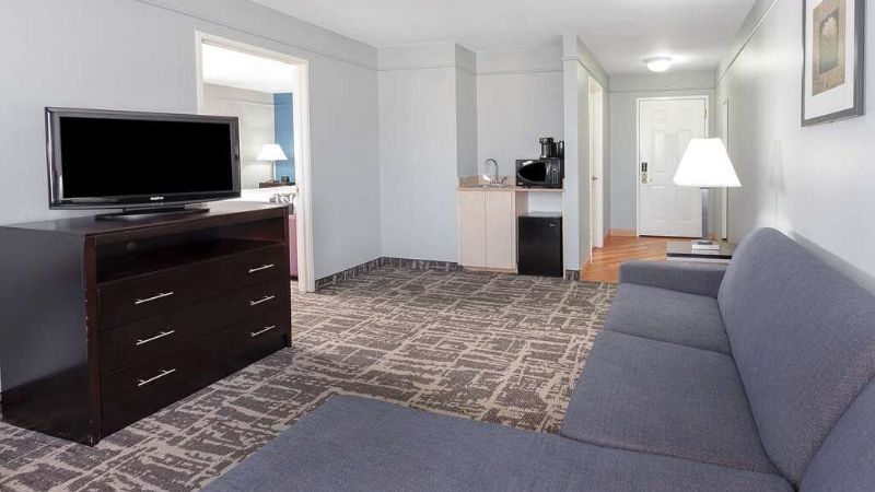 Rooms have a full size fridge, sofa bed, 2 queen beds and a chair. Plenty for 6 people to stay. Only downfall is beds are really firm and the pillows suck no cushion or plush. Bring your own if you're a sensitive sleeper.