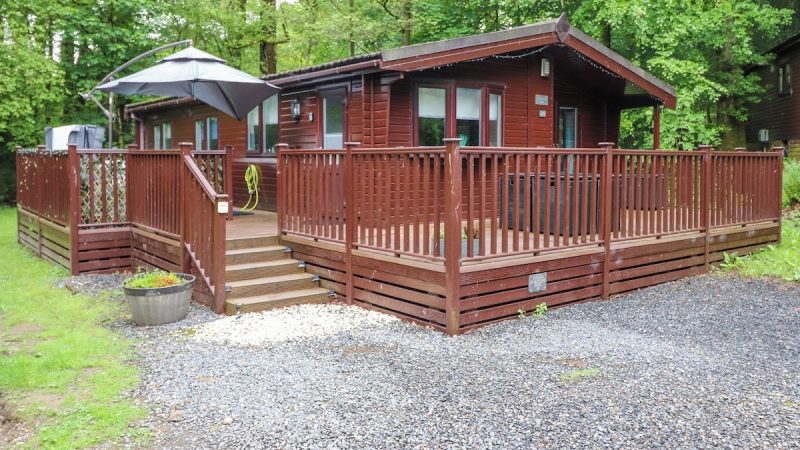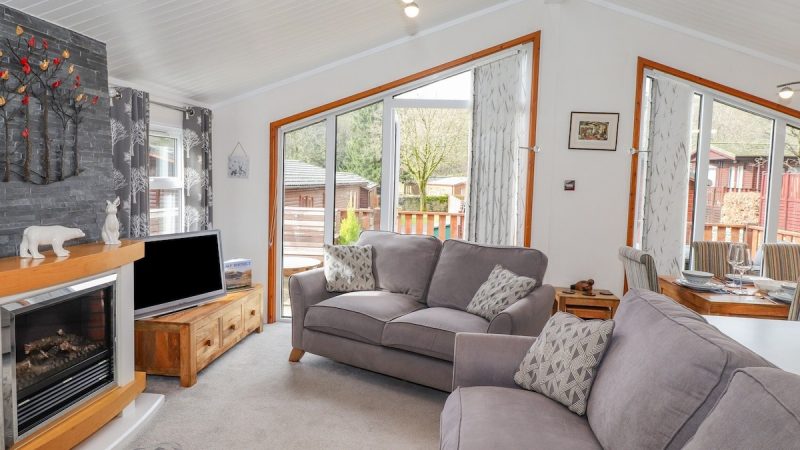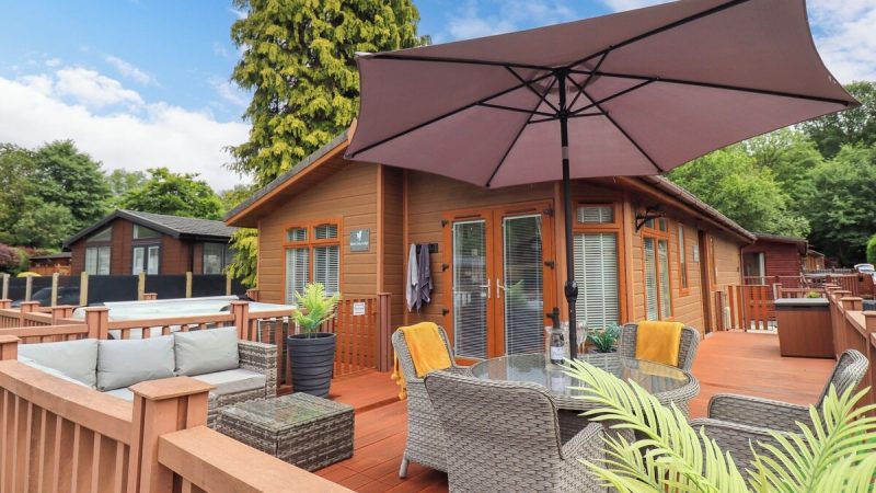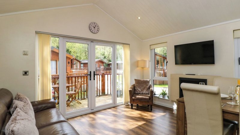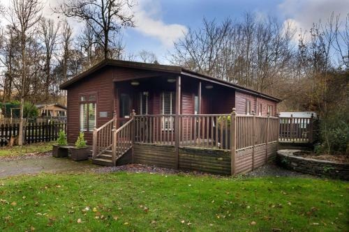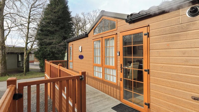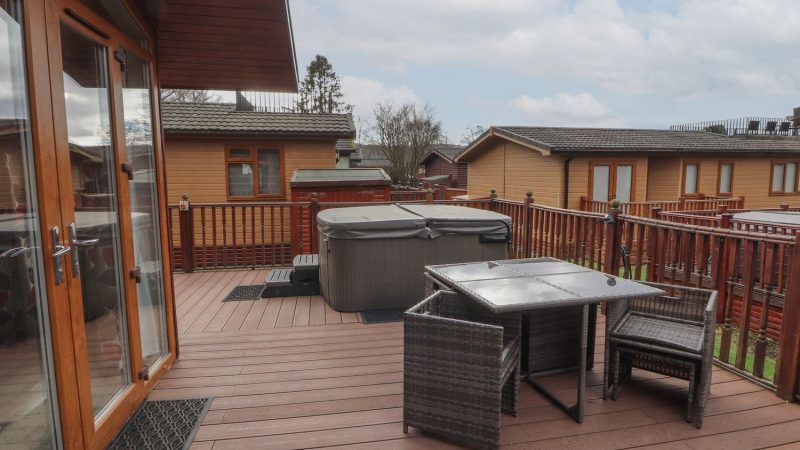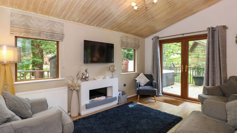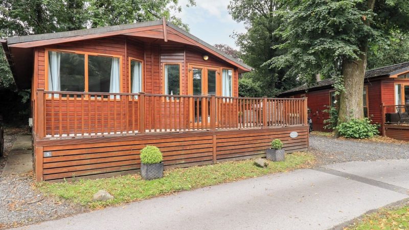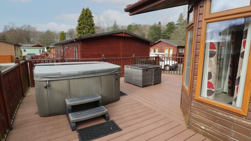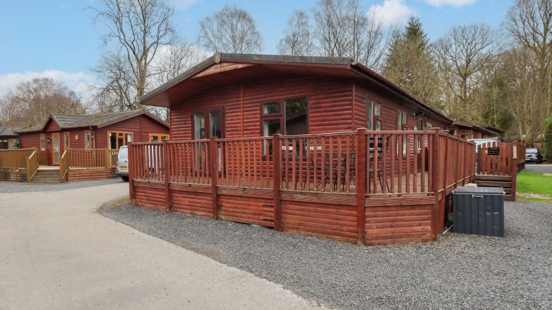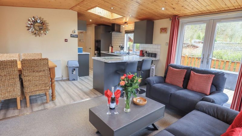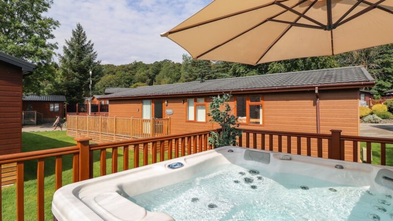 Bowness Lodge is a two-bedroom dog friendly lodge at Limefitt Park with an outdoor hot tub, open-plan living, and scenic surroundings, ideal for a relaxing getaway in the Lake District.