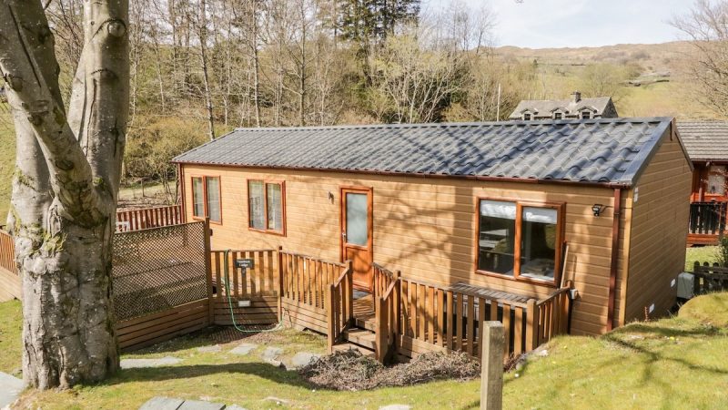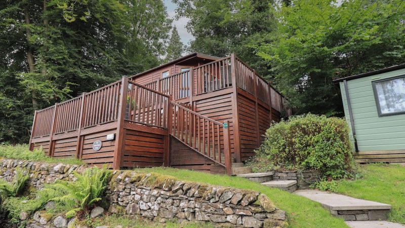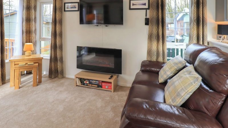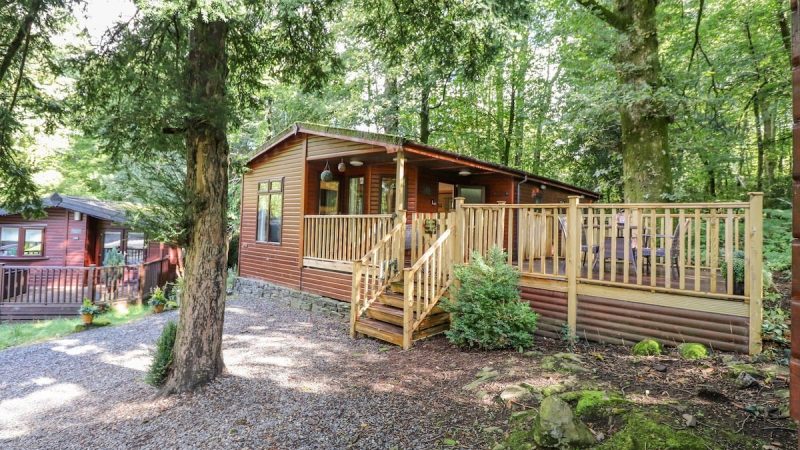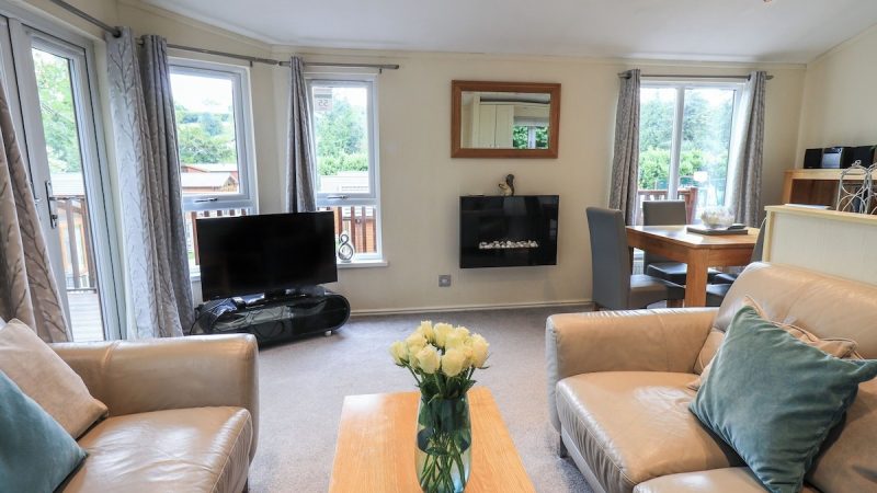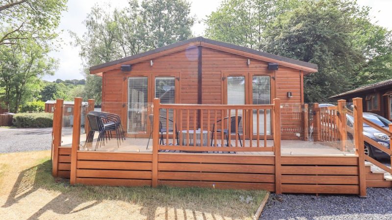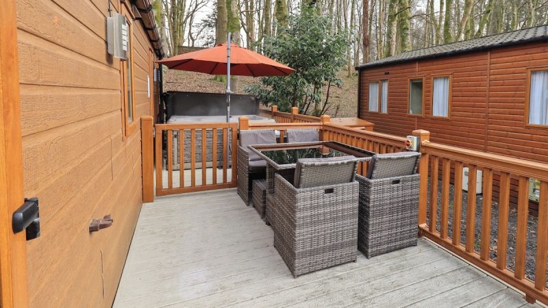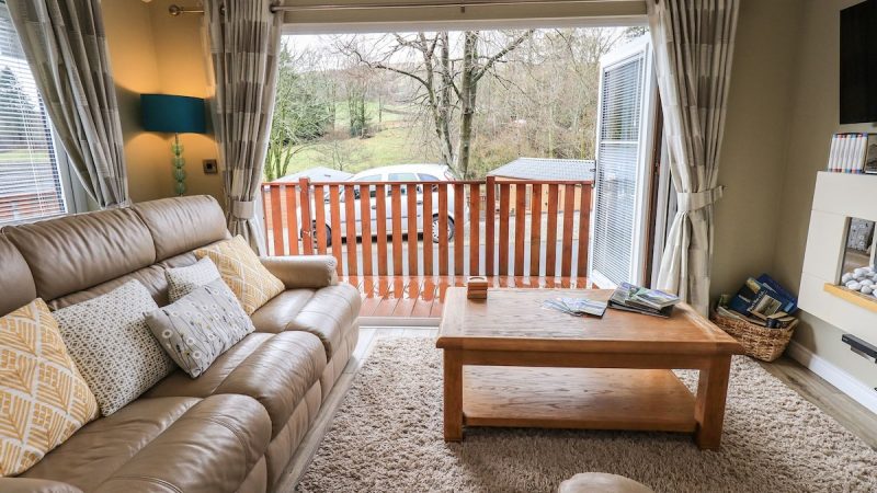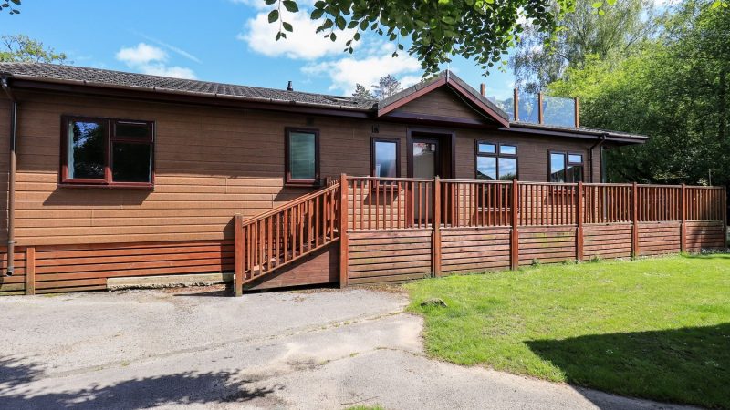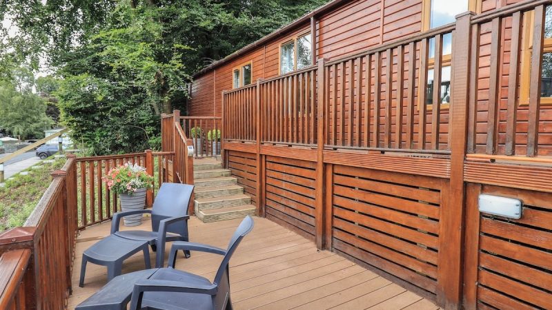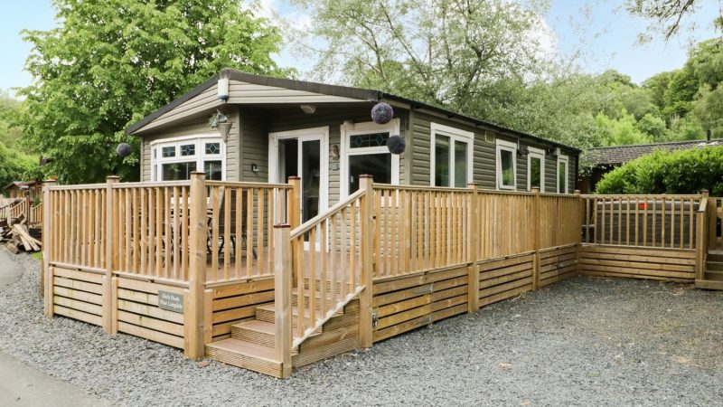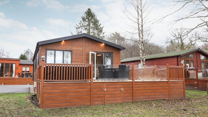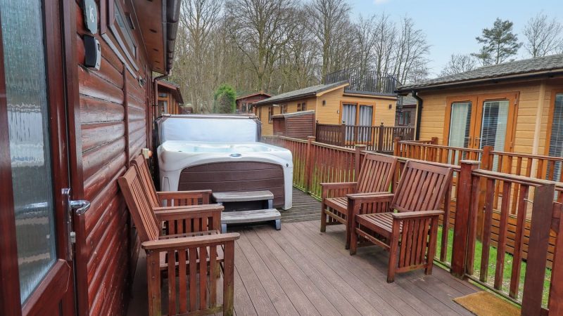 Bowness Lodge is a two-bedroom dog friendly lodge at Limefitt Park with an outdoor hot tub, open-plan living, and scenic surroundings, ideal for a relaxing getaway in the Lake District.