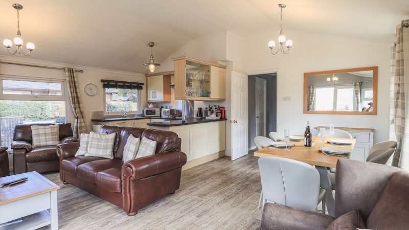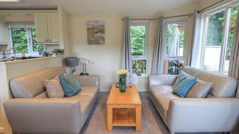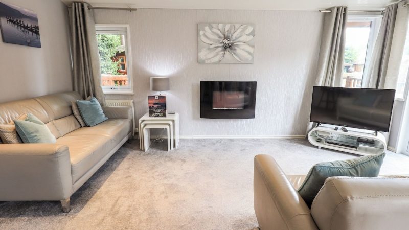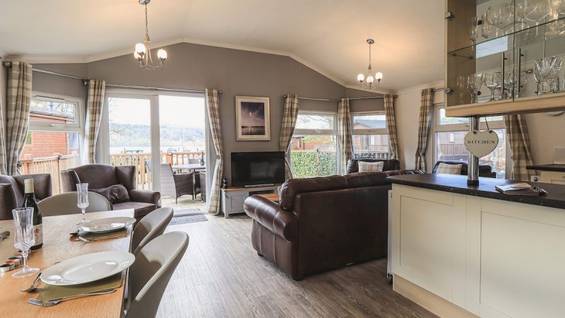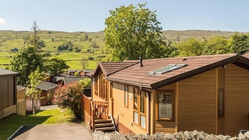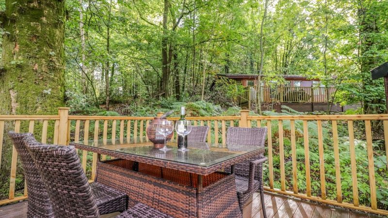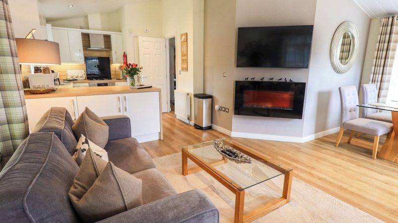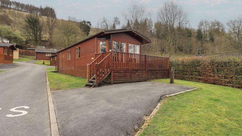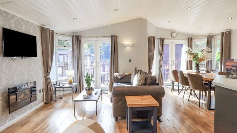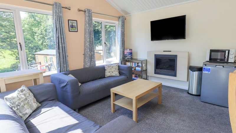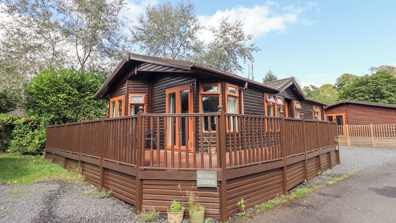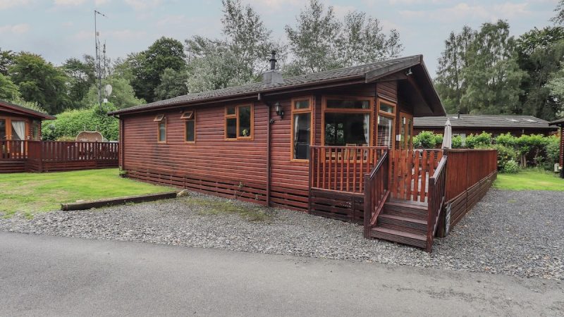 Bowness Lodge is a two-bedroom dog friendly lodge at Limefitt Park with an outdoor hot tub, open-plan living, and scenic surroundings, ideal for a relaxing getaway in the Lake District.