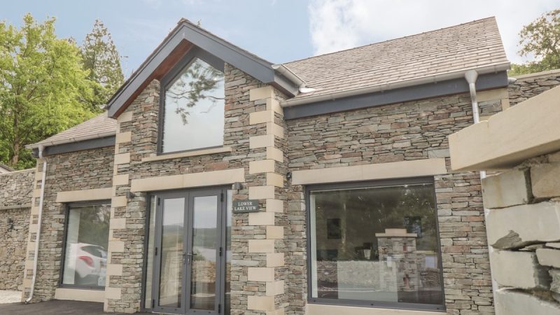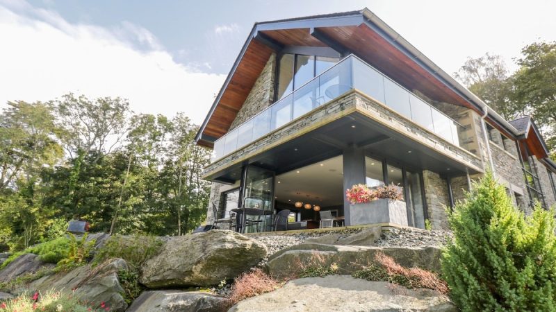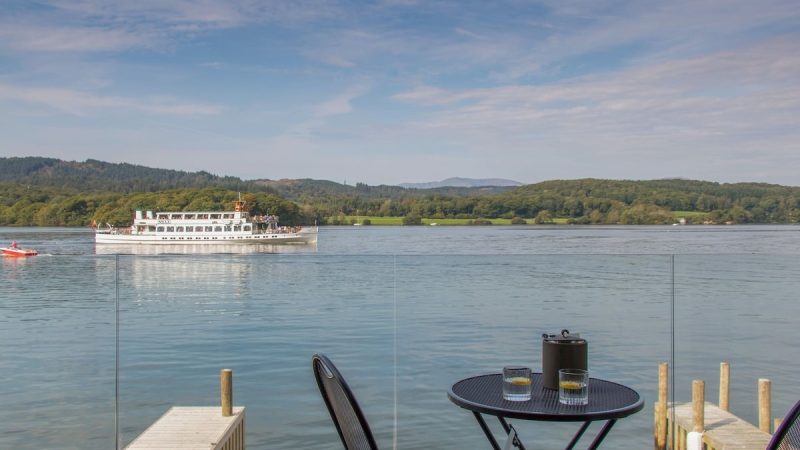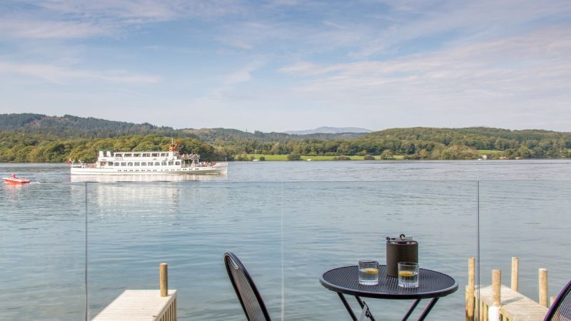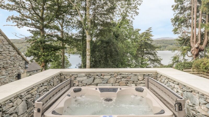 Louper Weir, sleeps eight in four en-suite double bedrooms. Enjoy a cinema-style TV, Sonos sound system, hot tub, multi-level garden, and private jetty. Perfect for a luxurious Lake District retreat.