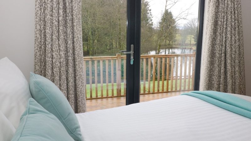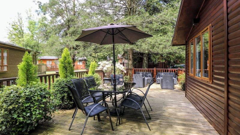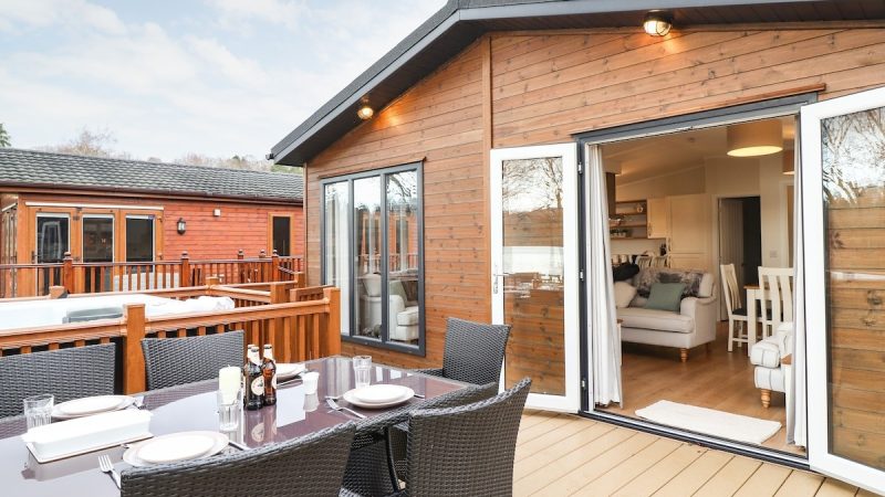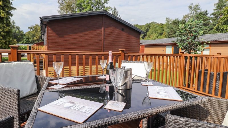 Bramblings by the Lake is a stylish single-storey lodge with three bedrooms, a well-equipped kitchen, and a lake-view deck with a hot tub.