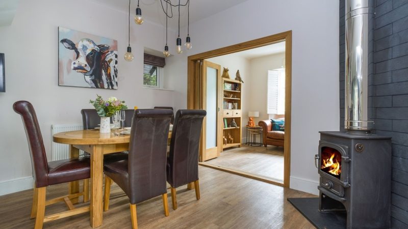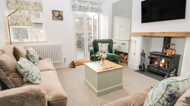 Green Stile Cottage accommodating five guests in three bedrooms, it offers a cozy living area with a woodburning stove, a hot tub, and a pet-friendly garden.