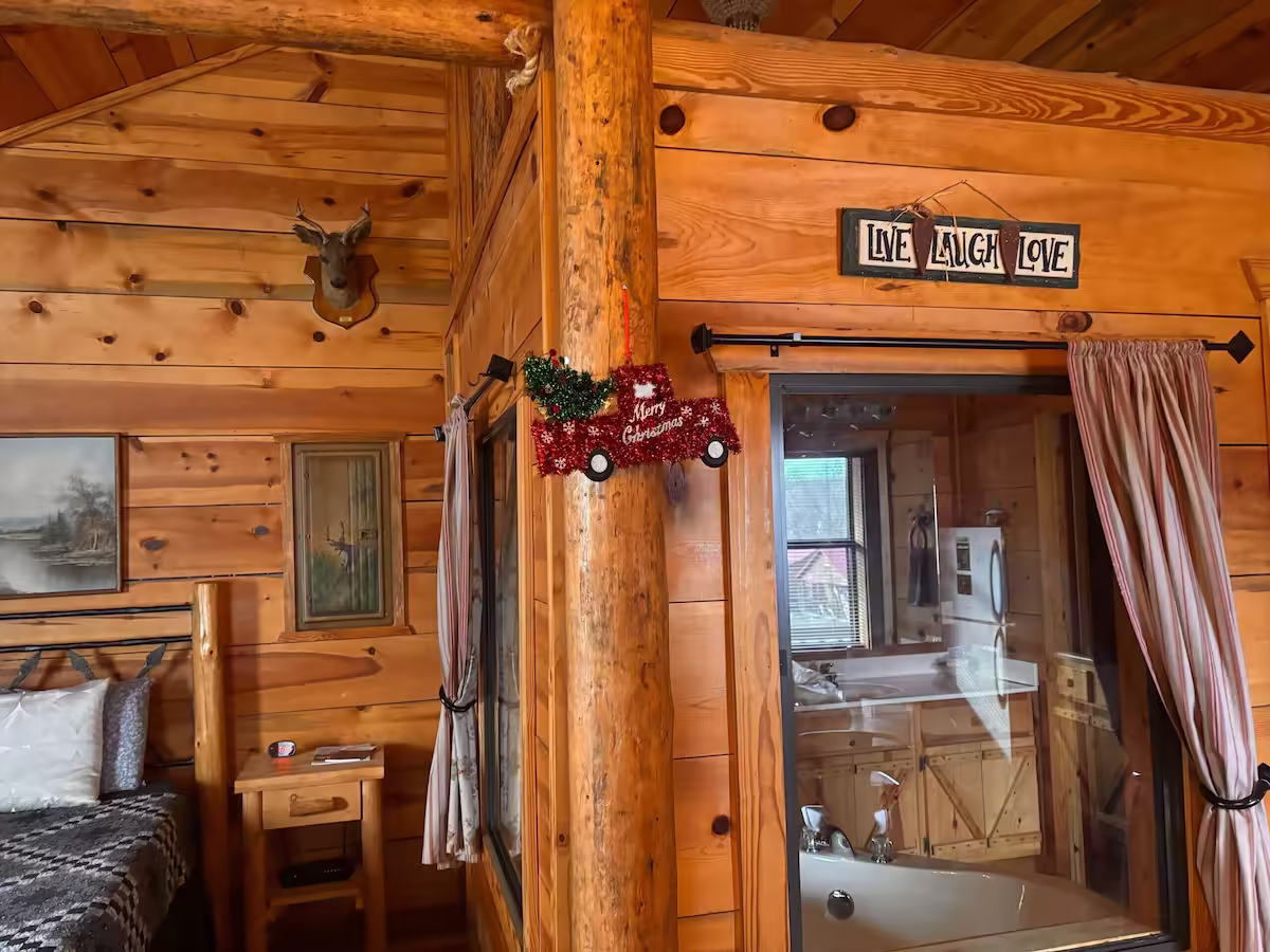 My husband and I had The Kennedy cabin for our wedding night. It was absolutely beautiful. We rented The Jackson cabin when we returned in December. It was a spacious and very private cabin. We warmed ourselves next to the fire, enjoyed the hot tub (which feels so good when it’s cooler outside). We absolutely loved the Valley View Hills Winery during our visit. The brick oven pizza is delicious and we got to enjoy our favorite wines that we had at our wedding. We even got a case to take home. The cabins and restaurant were beautifully decorated for the holiday. Also, at the office they have a paper with suggestions of things in the area. My husband and I went hiking at the Steppes. It was about an 8 minute drive from the cabin. The views were breathtaking. They have caves, waterfalls, and trails. I even saw fish swimming below the ice at the bottom of a frozen waterfall. My husband and I will be back this fall/winter and probably every year after too.