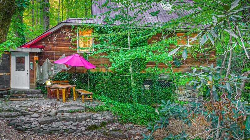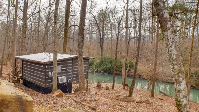 Riverside cabin with a private hot tub, stone garden, and deck, 14 min. from Georgia Mountain Coaster.