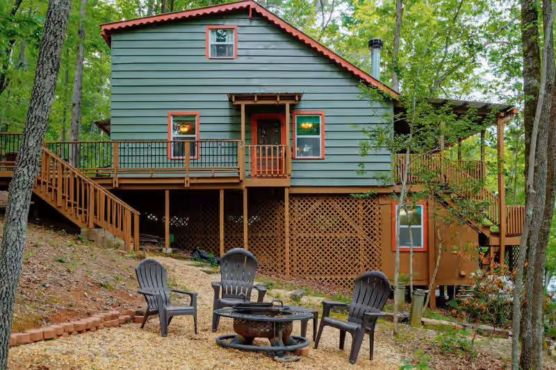 Riverside cabin with WiFi, parking, pet-friendly amenities, fireplace, and cozy loft bedroom overlooking the Chattahoochee River near downtown.