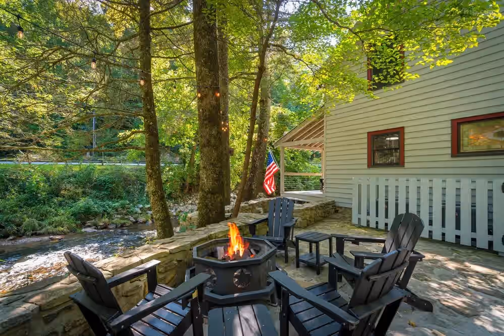 Riverside cabin with hot tub, WiFi, AC, parking, pet-friendly amenities, and firepit overlooking the Chattahoochee River near downtown Helen.