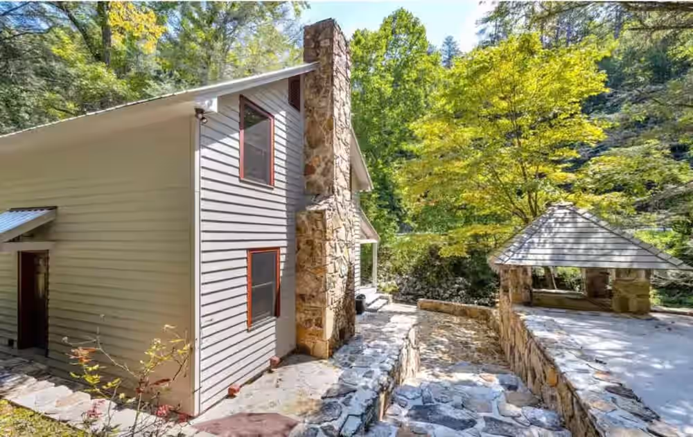Charming cabin with hot tub, WiFi, AC, parking, pet-friendly amenities, and brookside views surrounded by woodland tranquility near Helen, Georgia.