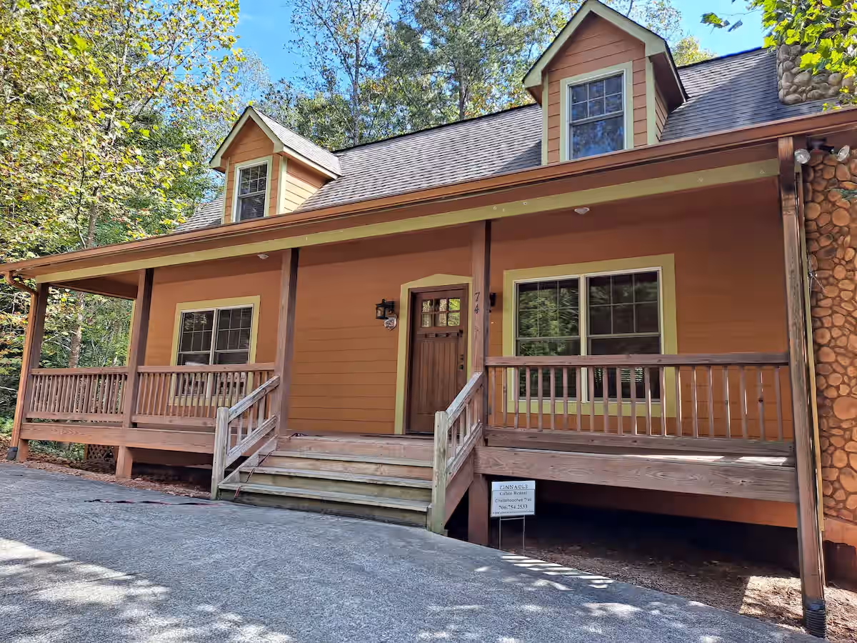 Spacious cabin with hot tub, pool table, WiFi, AC, parking, pet-friendly amenities, and scenic porches near wineries within Helen city limits.