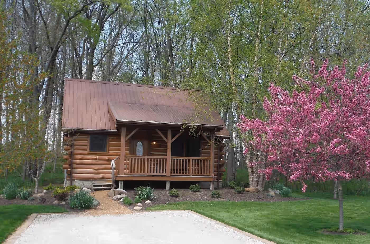 Luxury log cabins with stone fireplaces, private hot tubs, full kitchens, and screened porches, close to Indianapolis.