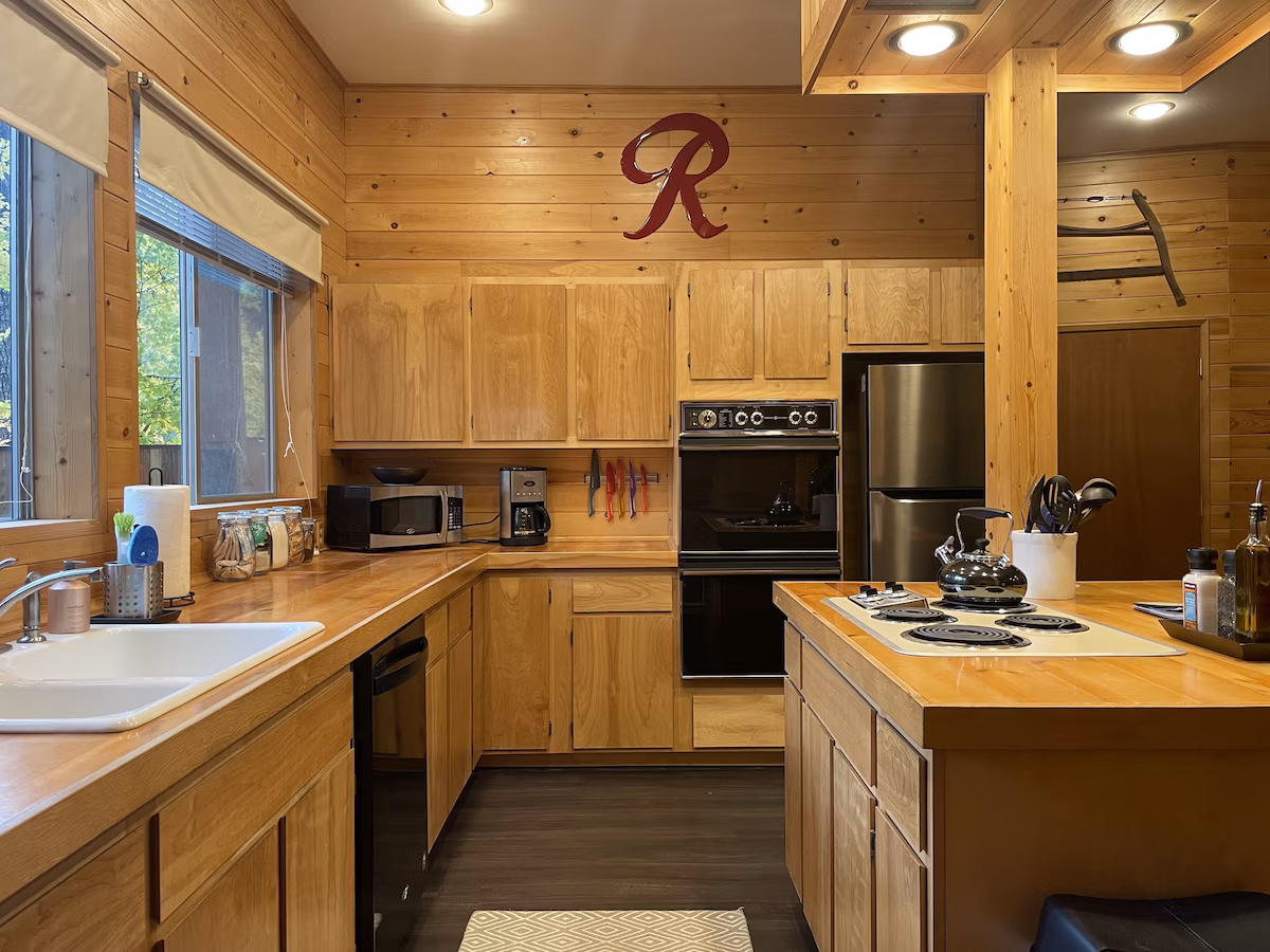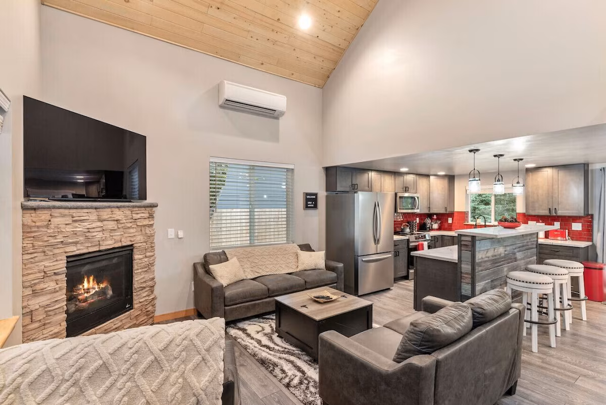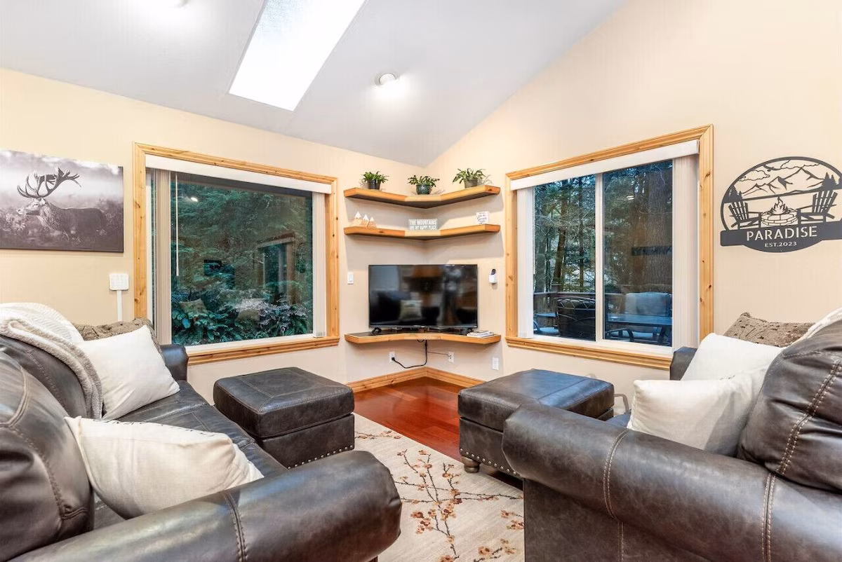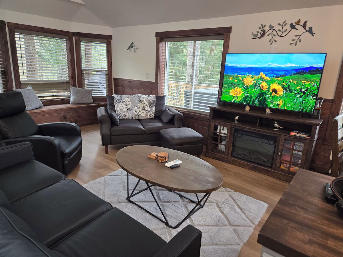 Spacious 3-bedroom cabin with private hot tub, gourmet kitchen, gas fireplace, Starlink Wi-Fi, and EV charger, nestled near Mt. Rainier.