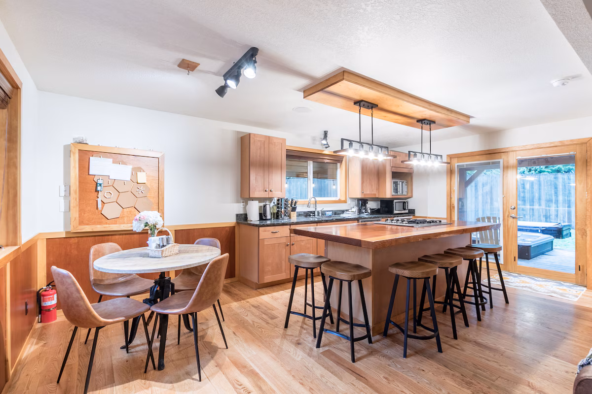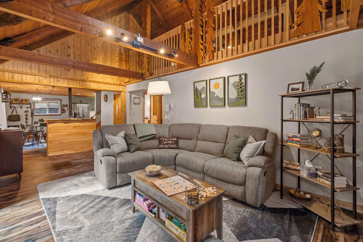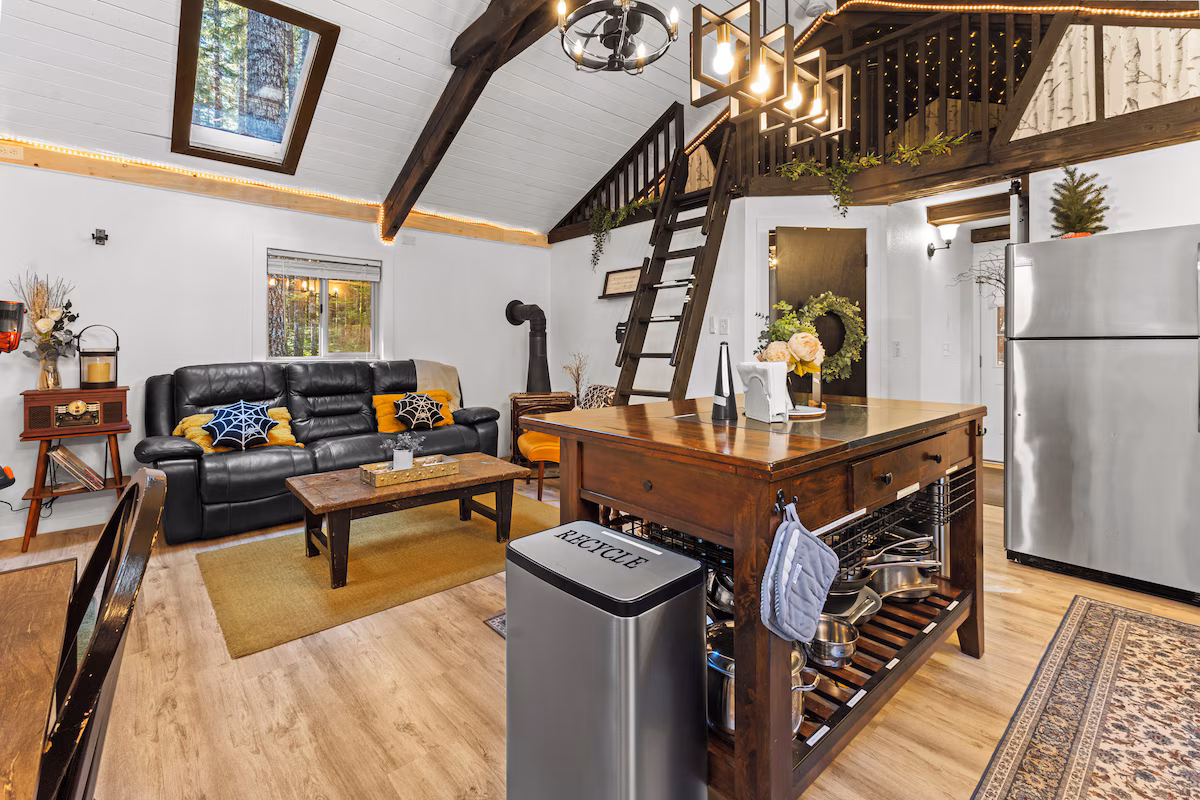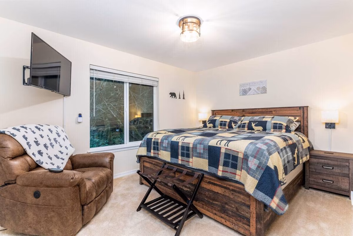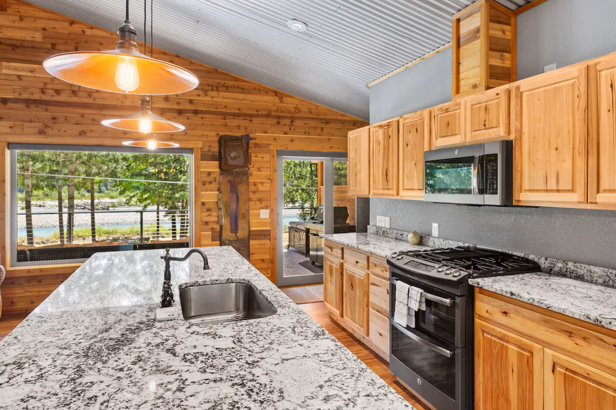 Spacious 3-bedroom cabin with private hot tub, gourmet kitchen, gas fireplace, Starlink Wi-Fi, and EV charger, nestled near Mt. Rainier.