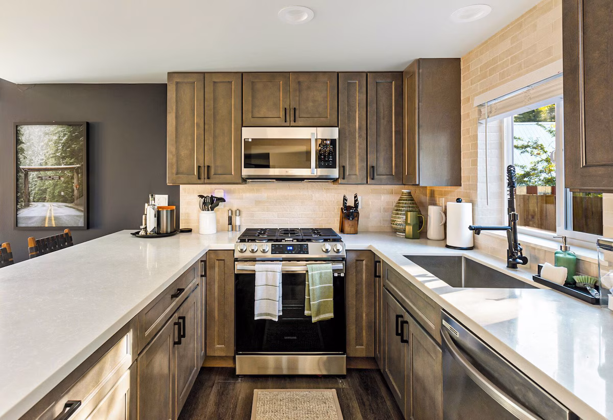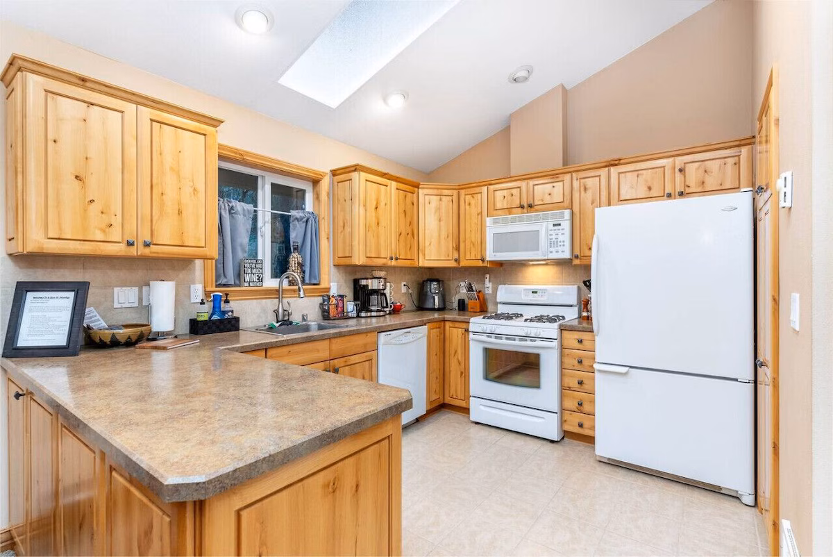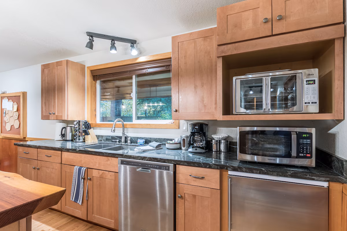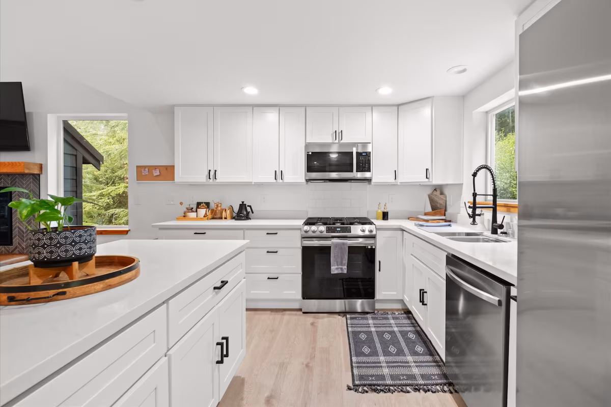 Spacious 3-bedroom cabin with private hot tub, gourmet kitchen, gas fireplace, Starlink Wi-Fi, and EV charger, nestled near Mt. Rainier.