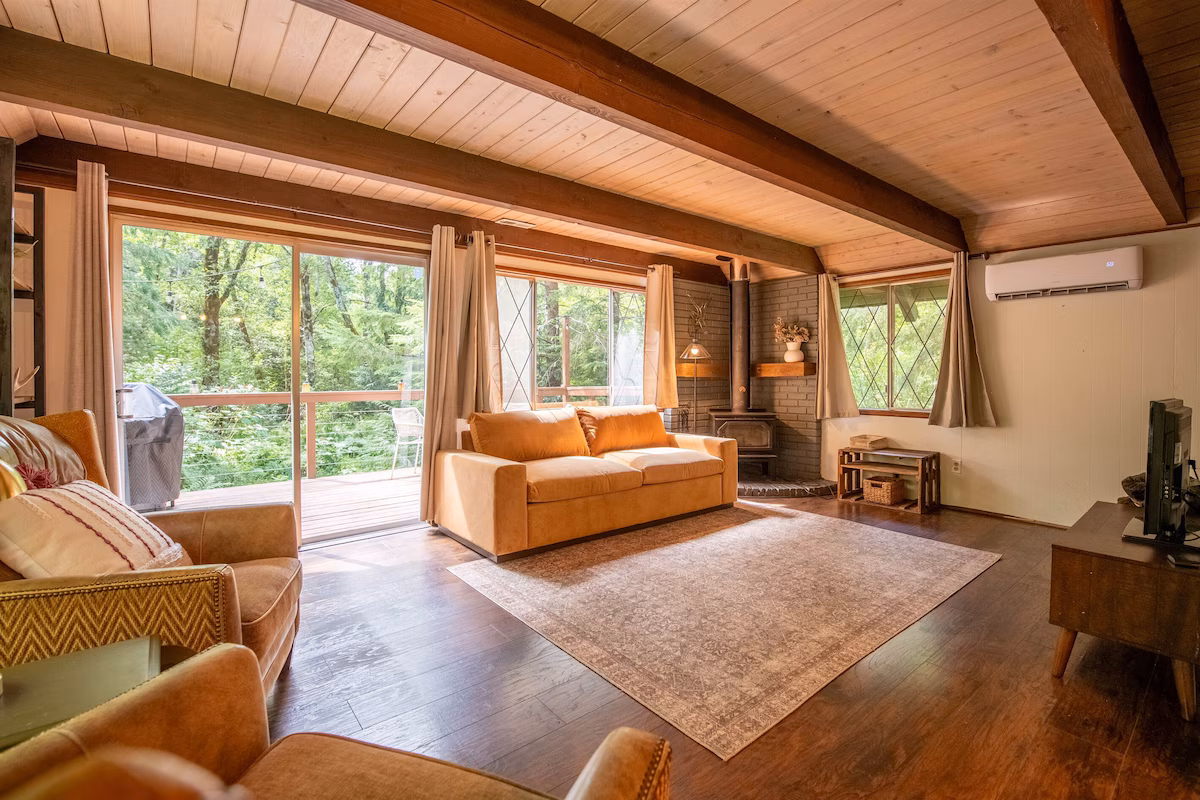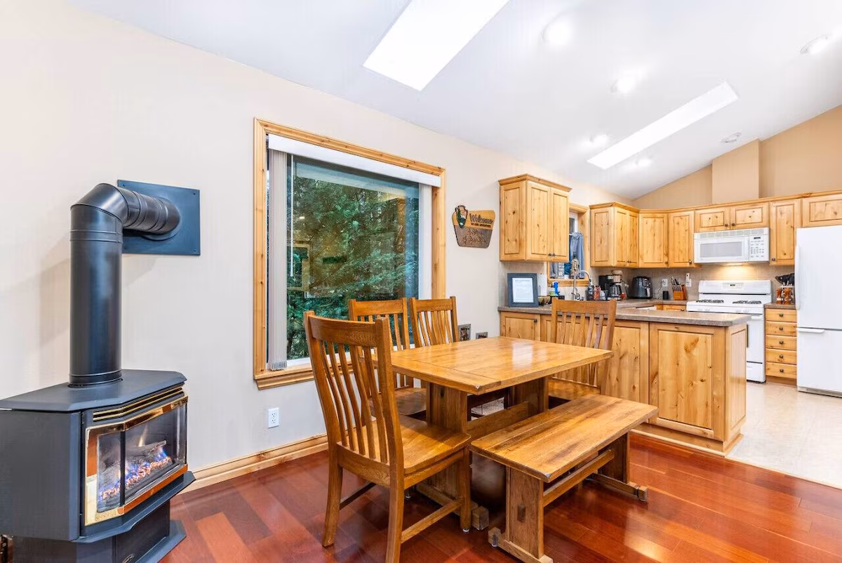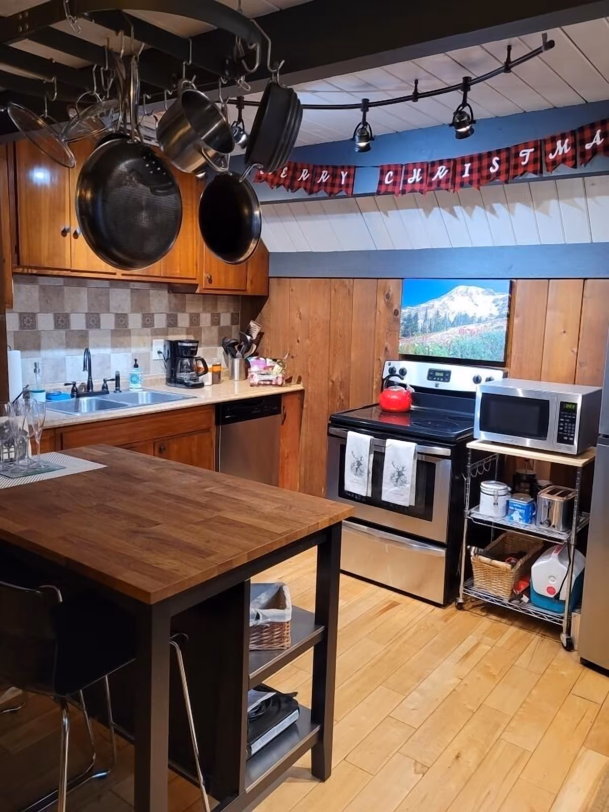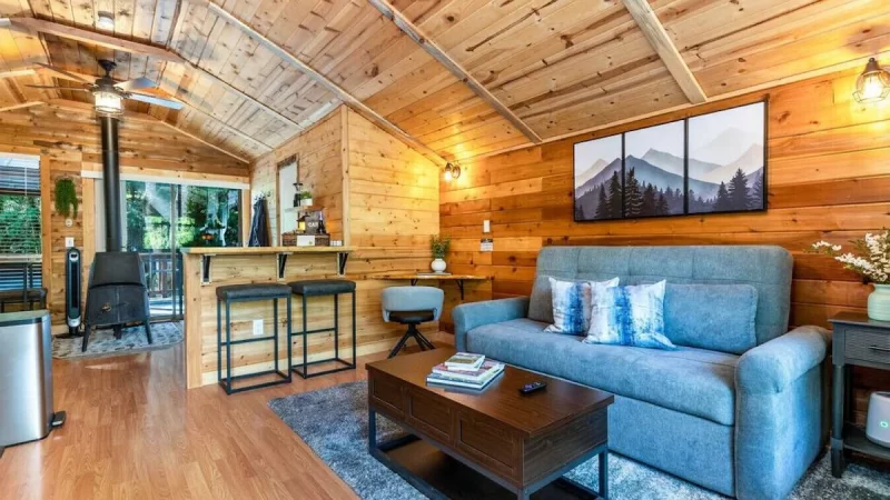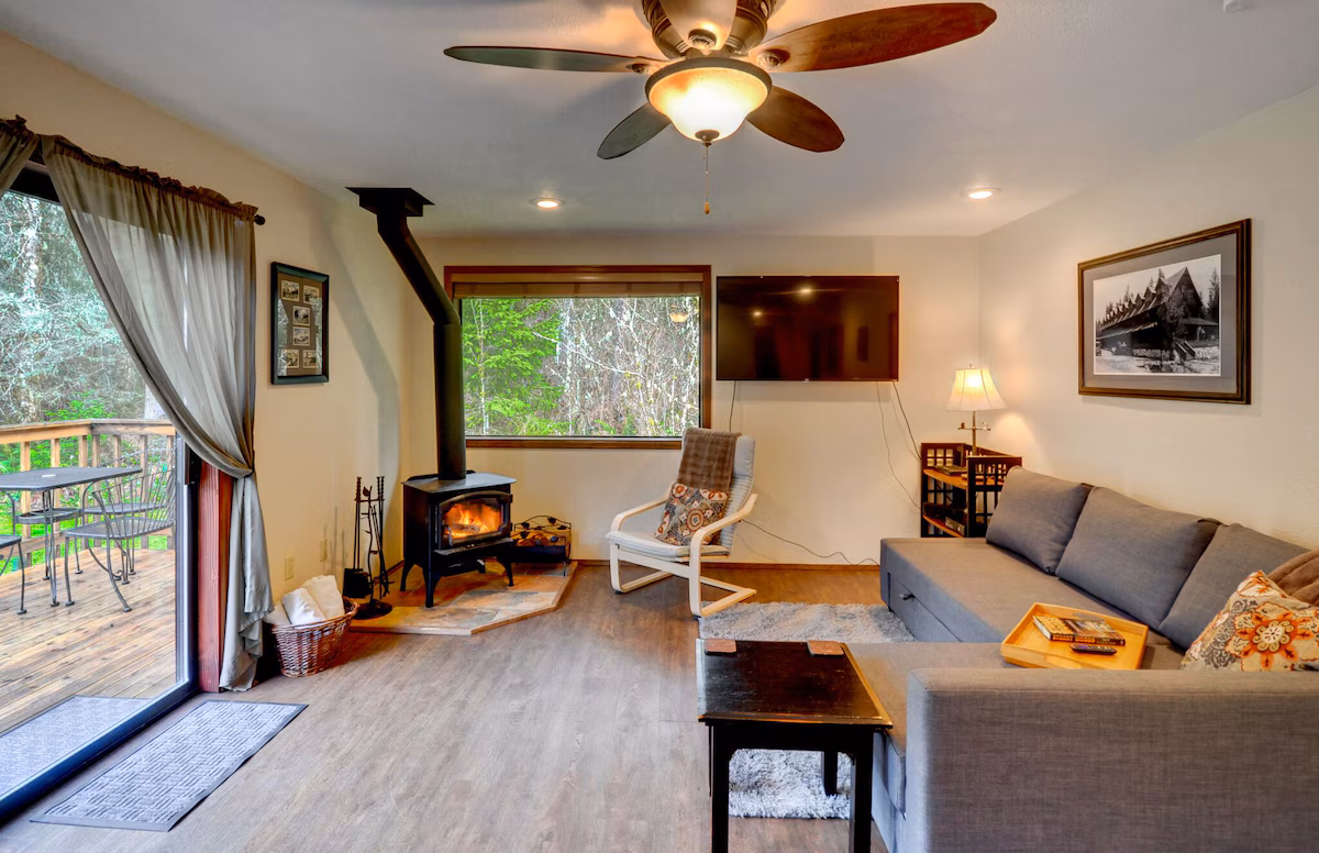 Cozy 1-bedroom cabin with wood stove, full kitchen, outdoor hot tub, Wi-Fi, and 60″ TV, just 5 minutes from Mt. Rainier National Park.