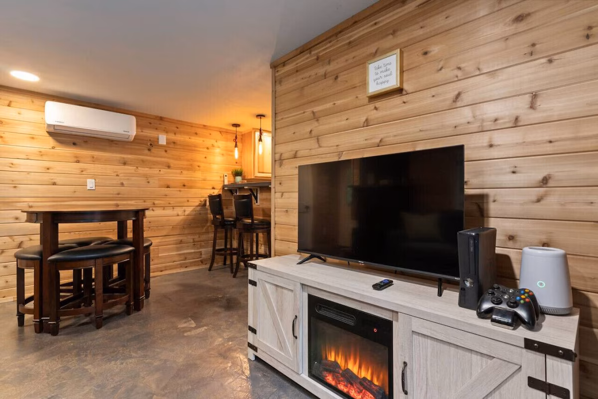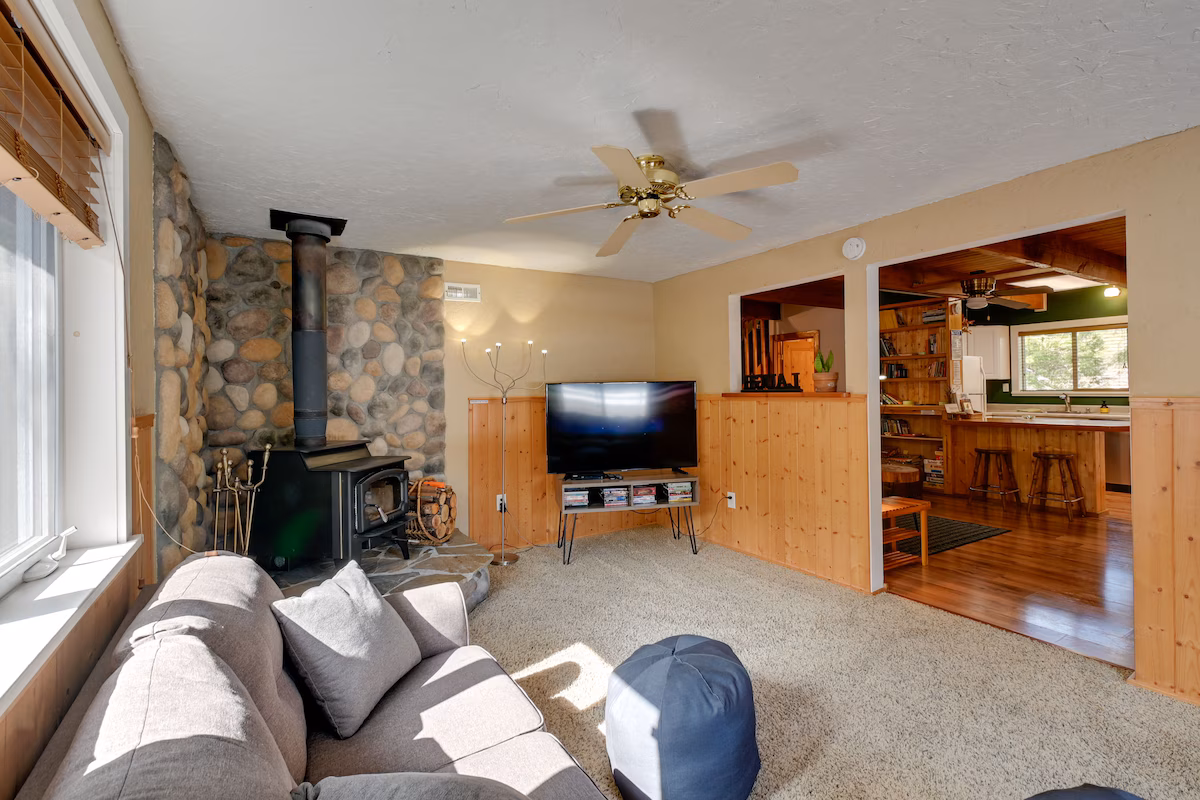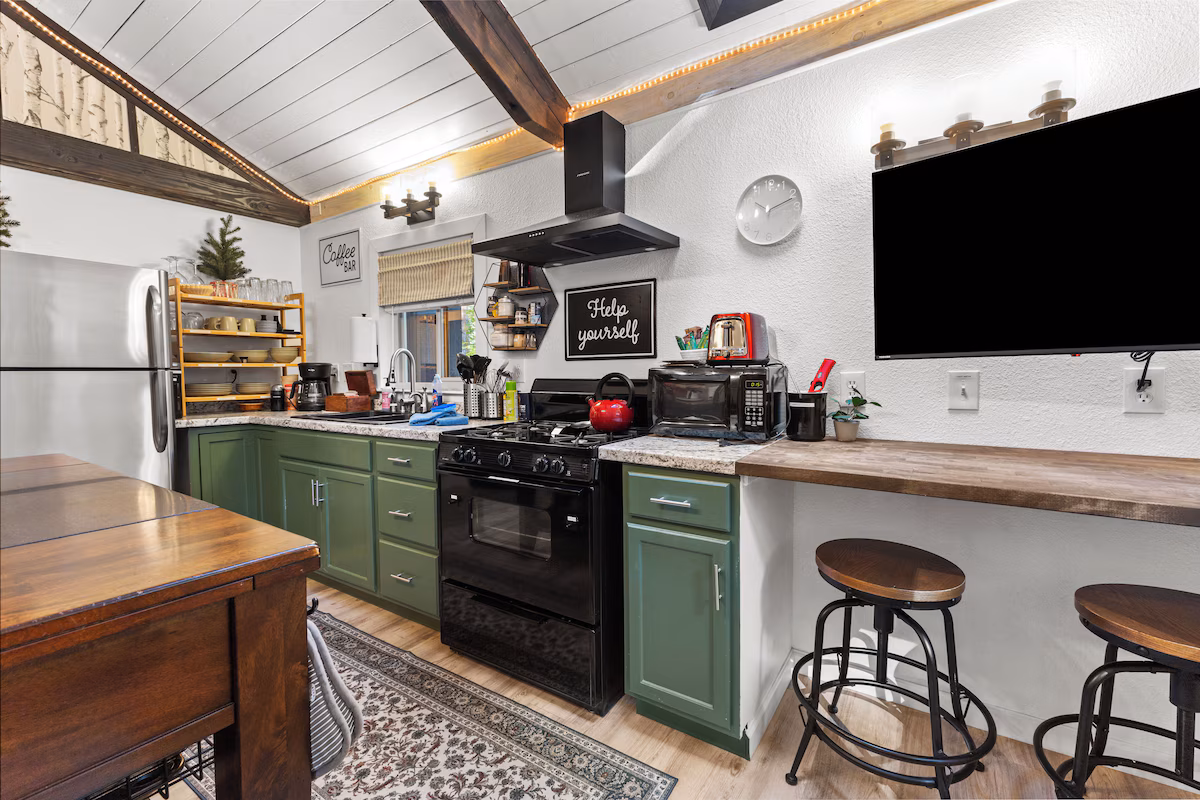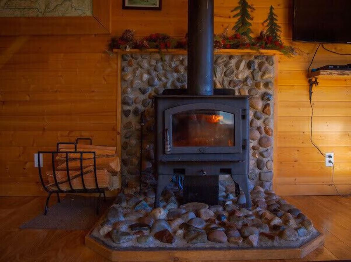 Cozy 1-bedroom cabin with wood stove, full kitchen, outdoor hot tub, Wi-Fi, and 60″ TV, just 5 minutes from Mt. Rainier National Park.