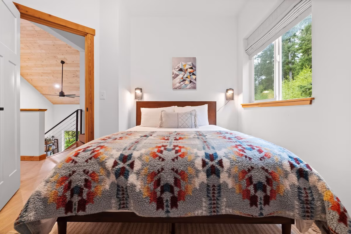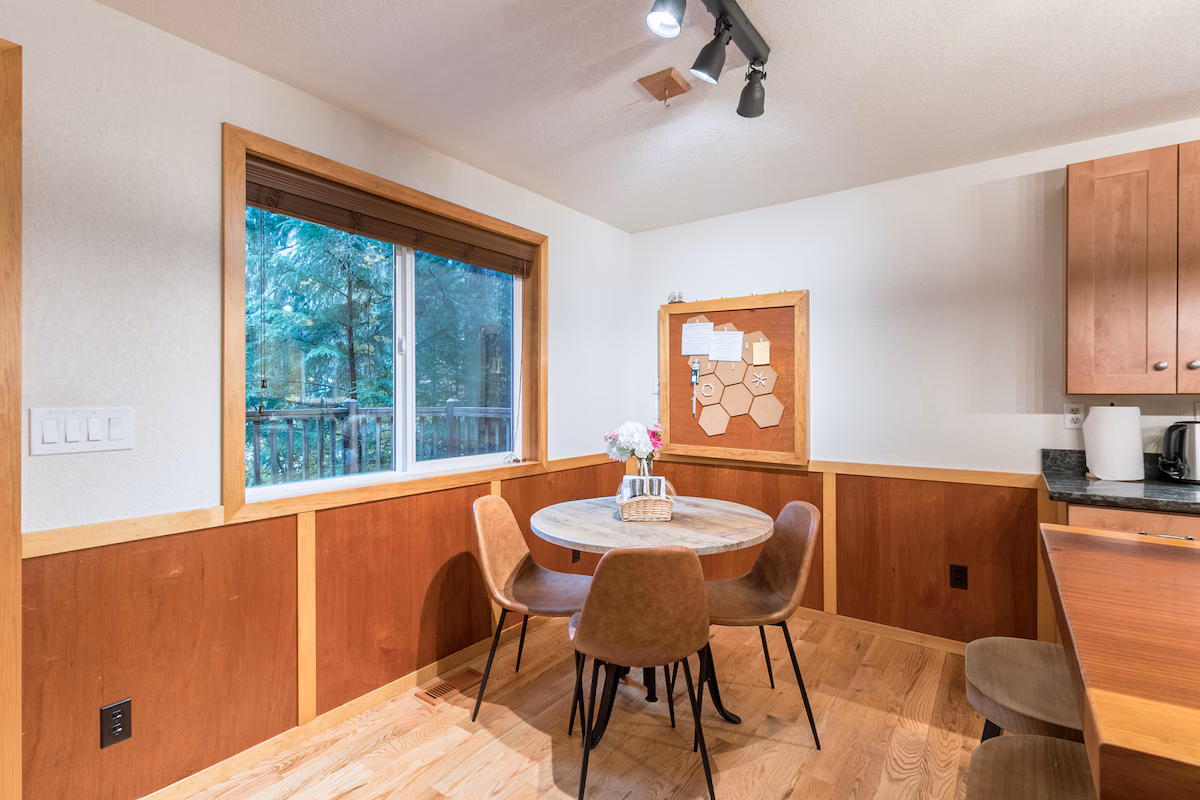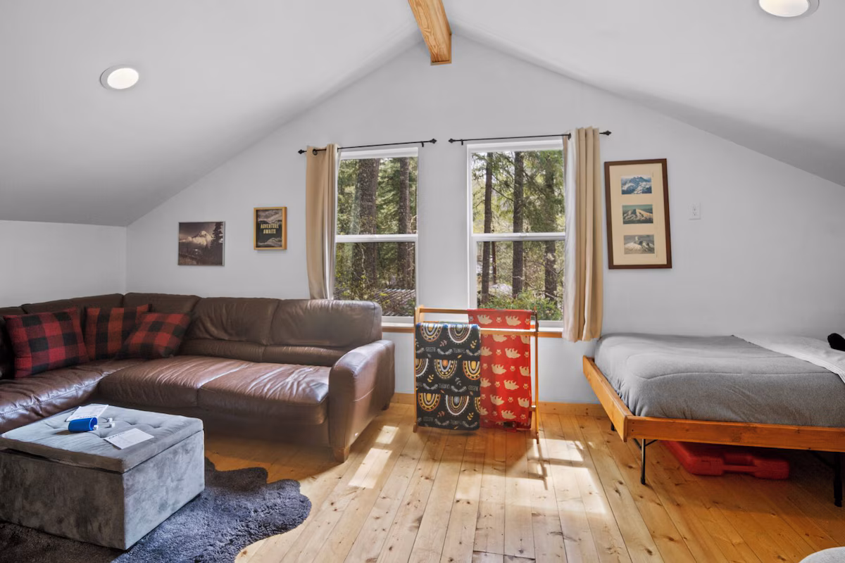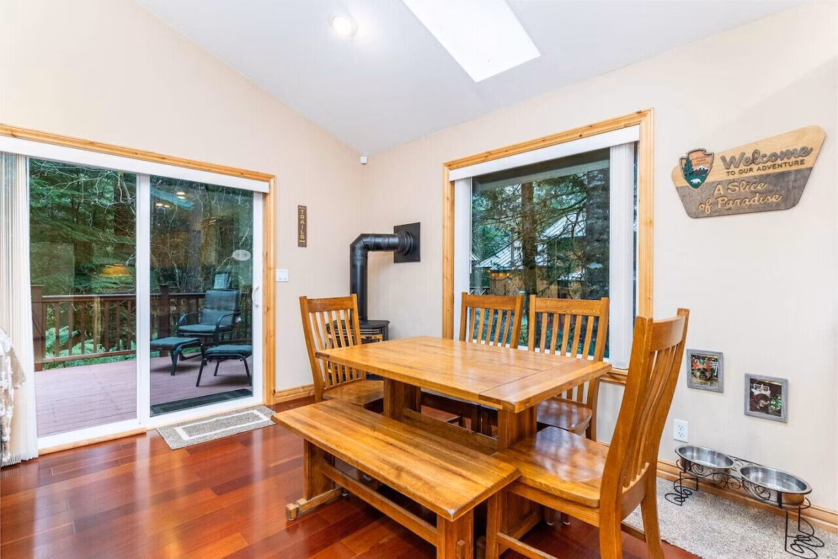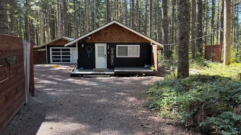 Updated forest cabin with cedar hot tub, fire pit, full kitchen, wood stove, and A-frame sleeping loft, minutes from Mt. Rainier’s Nisqually entrance.