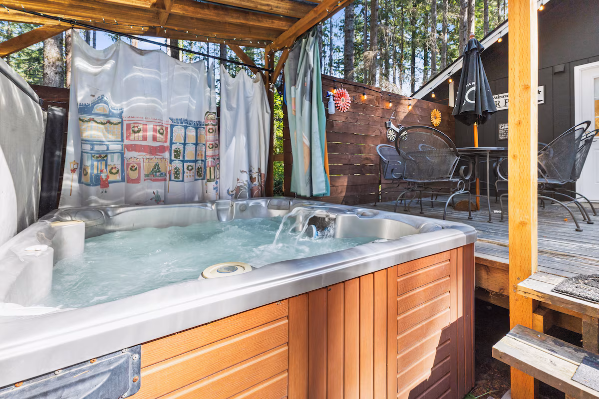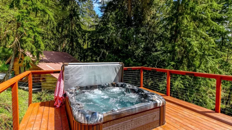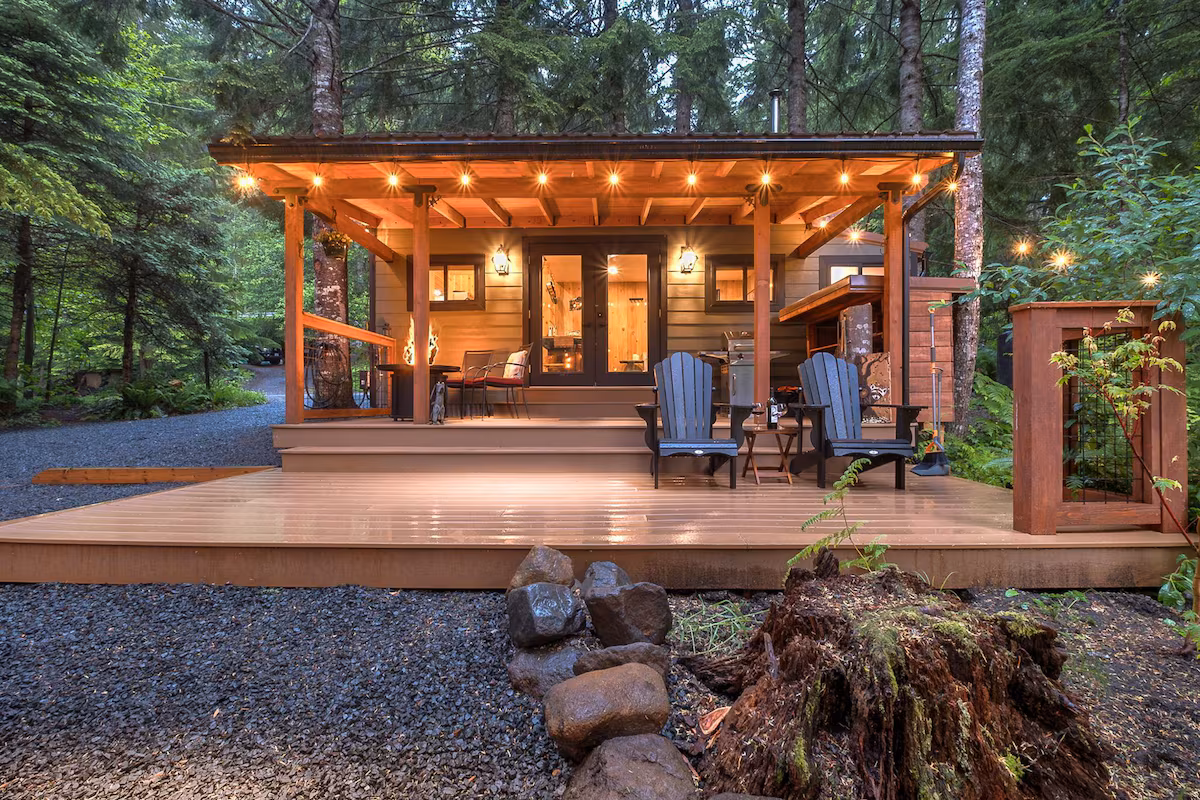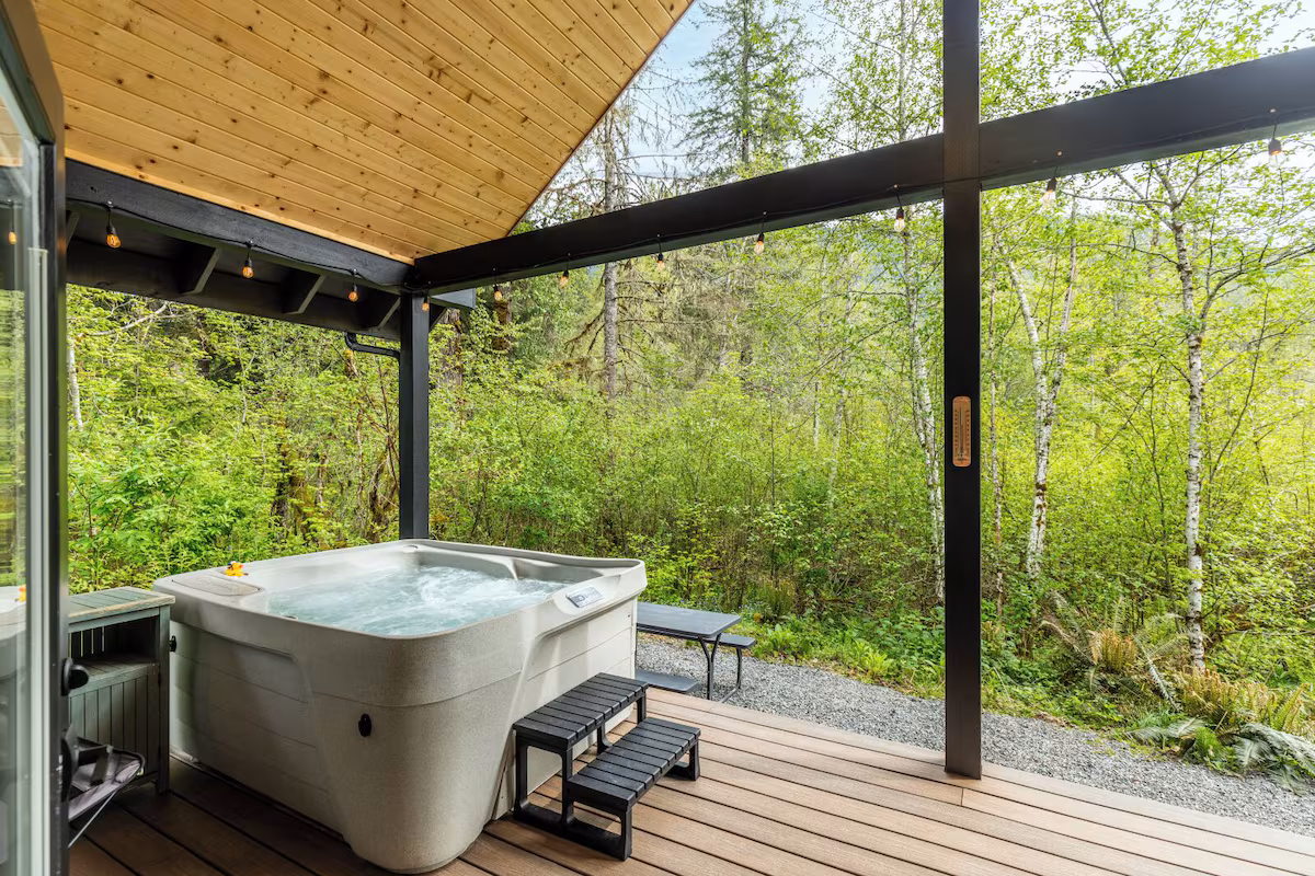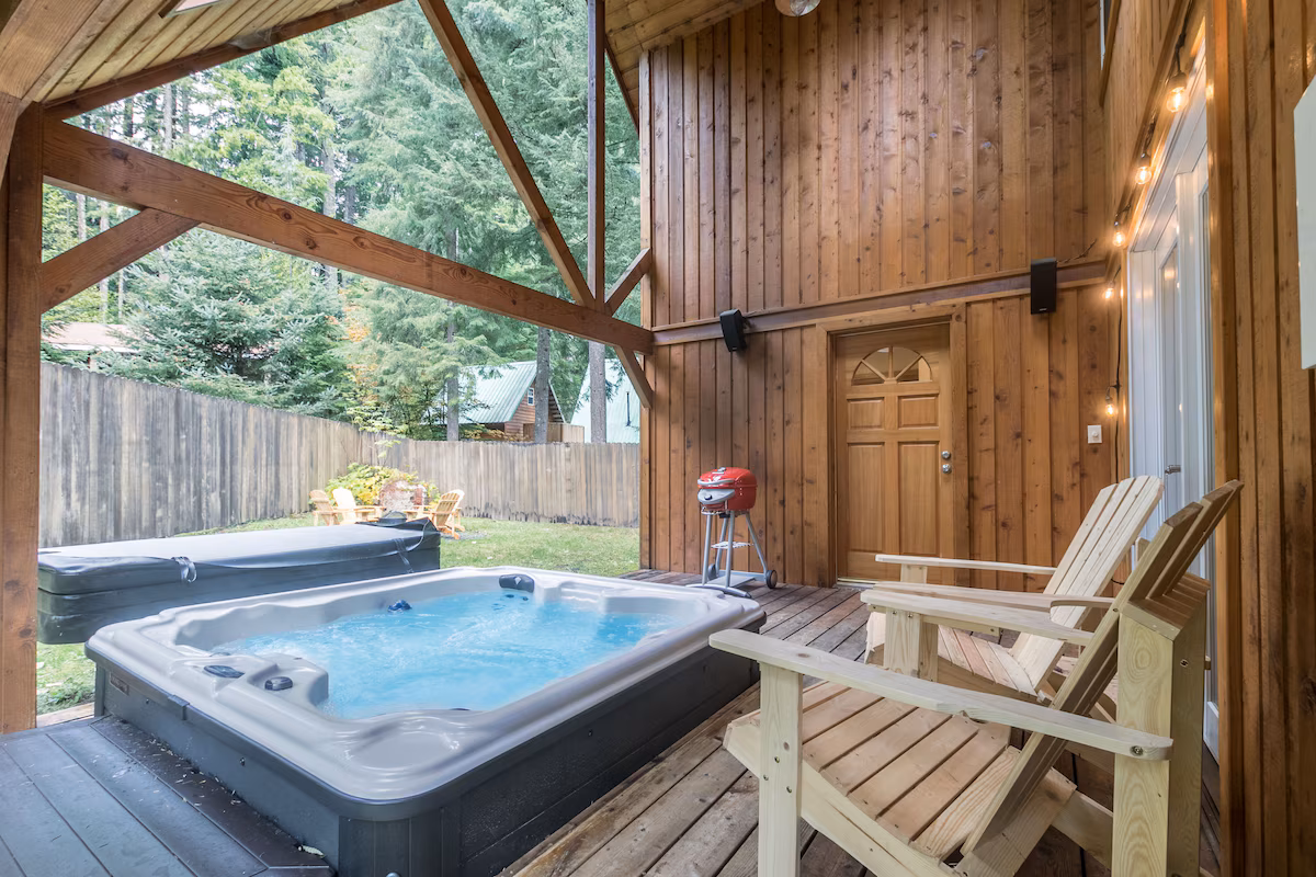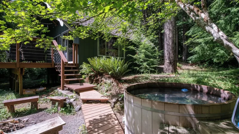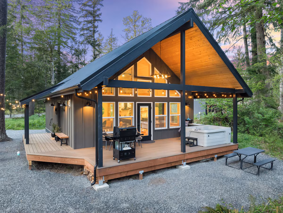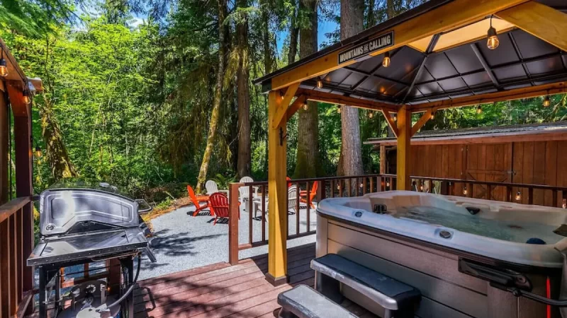 The Mt. Rainier cabins with hot tub offer a cozy stay with breathtaking forest views.