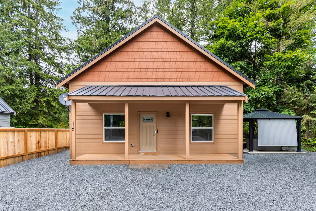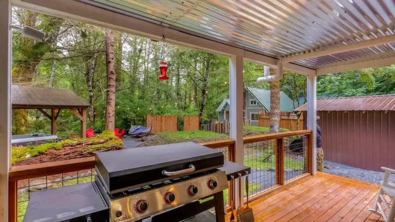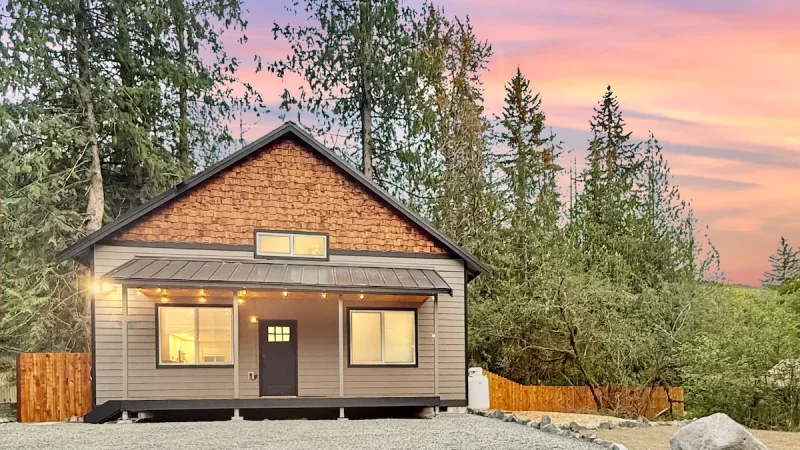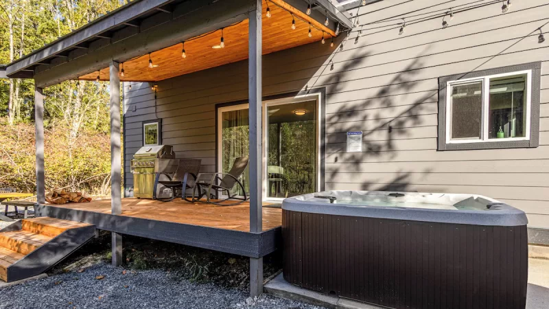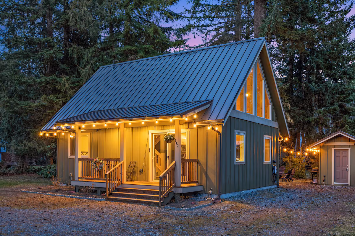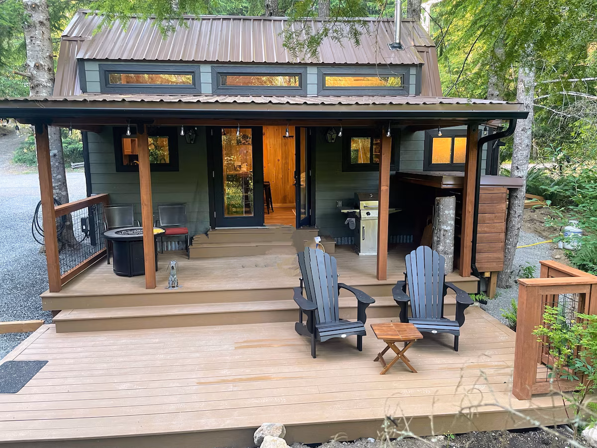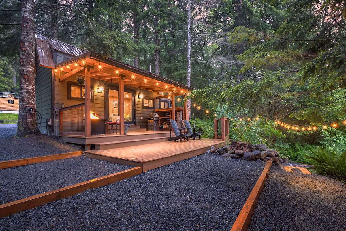 Remodeled tiny home with hot tub, fire pit, full kitchen, smart TV, and creekside deck, just 6 minutes from Mount Rainier National Park.