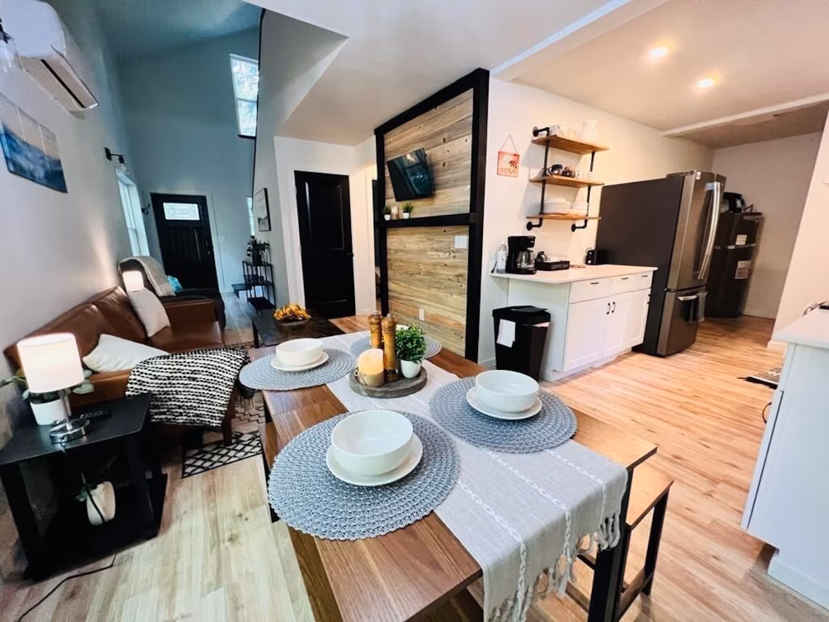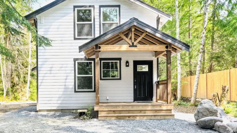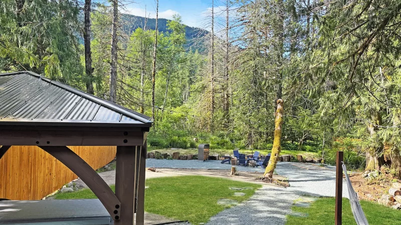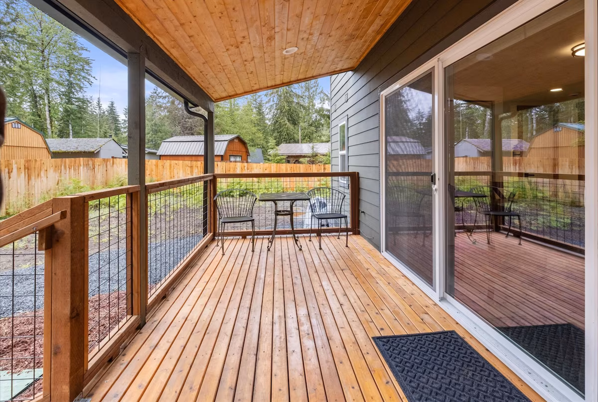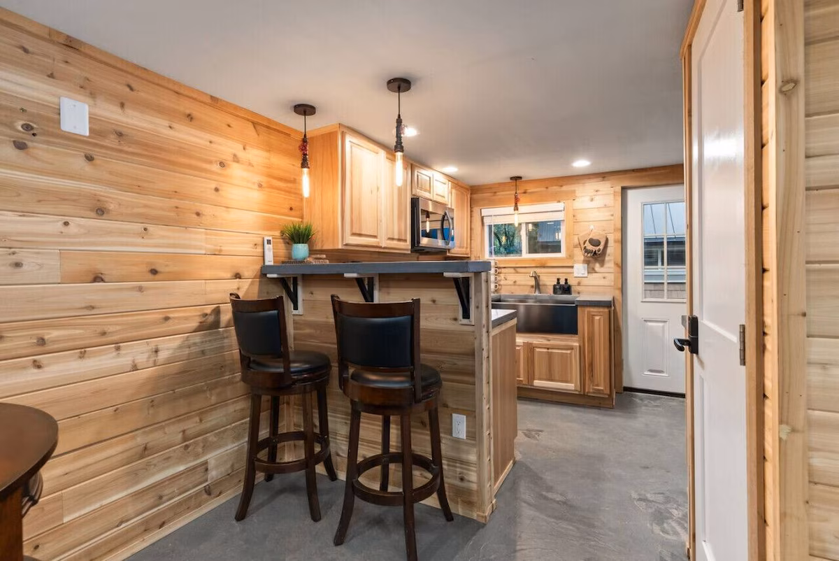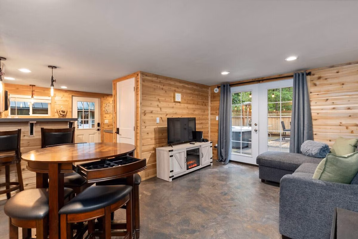 Remodeled tiny home with hot tub, fire pit, full kitchen, smart TV, and creekside deck, just 6 minutes from Mount Rainier National Park.