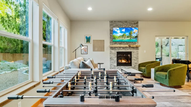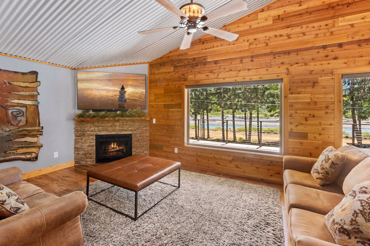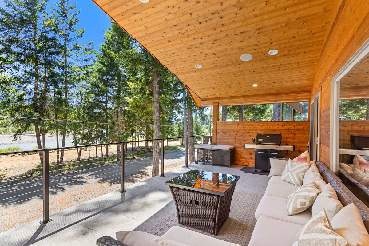 Luxury riverfront manor with hot tub access, game room, fire pits, full kitchen, and stunning views, near Mount Rainier’s Cowlitz River.