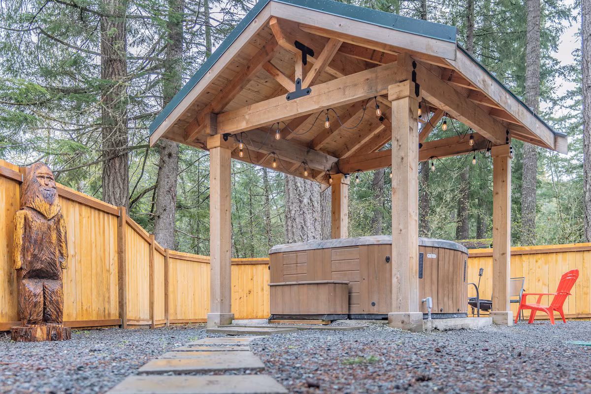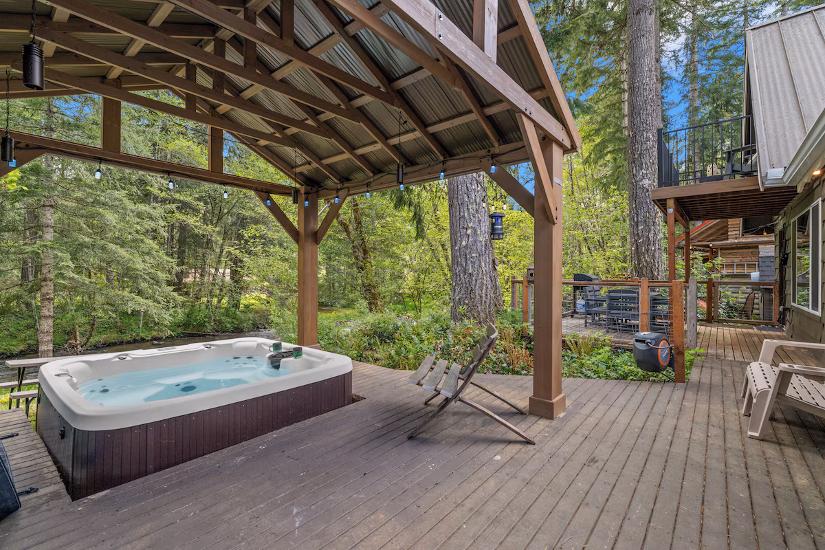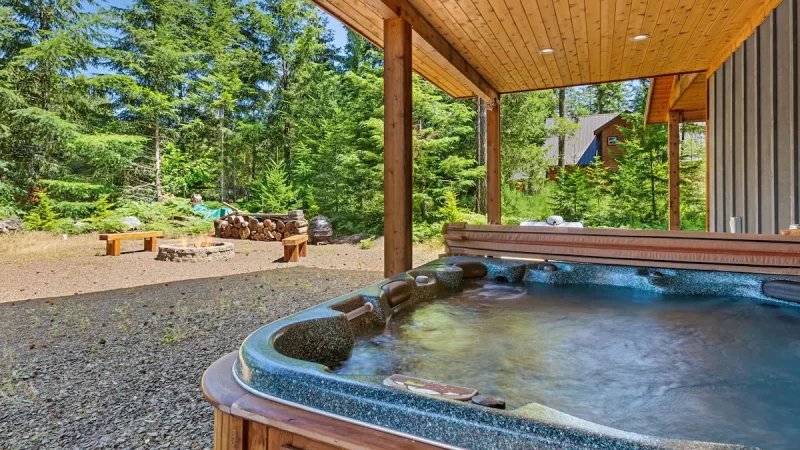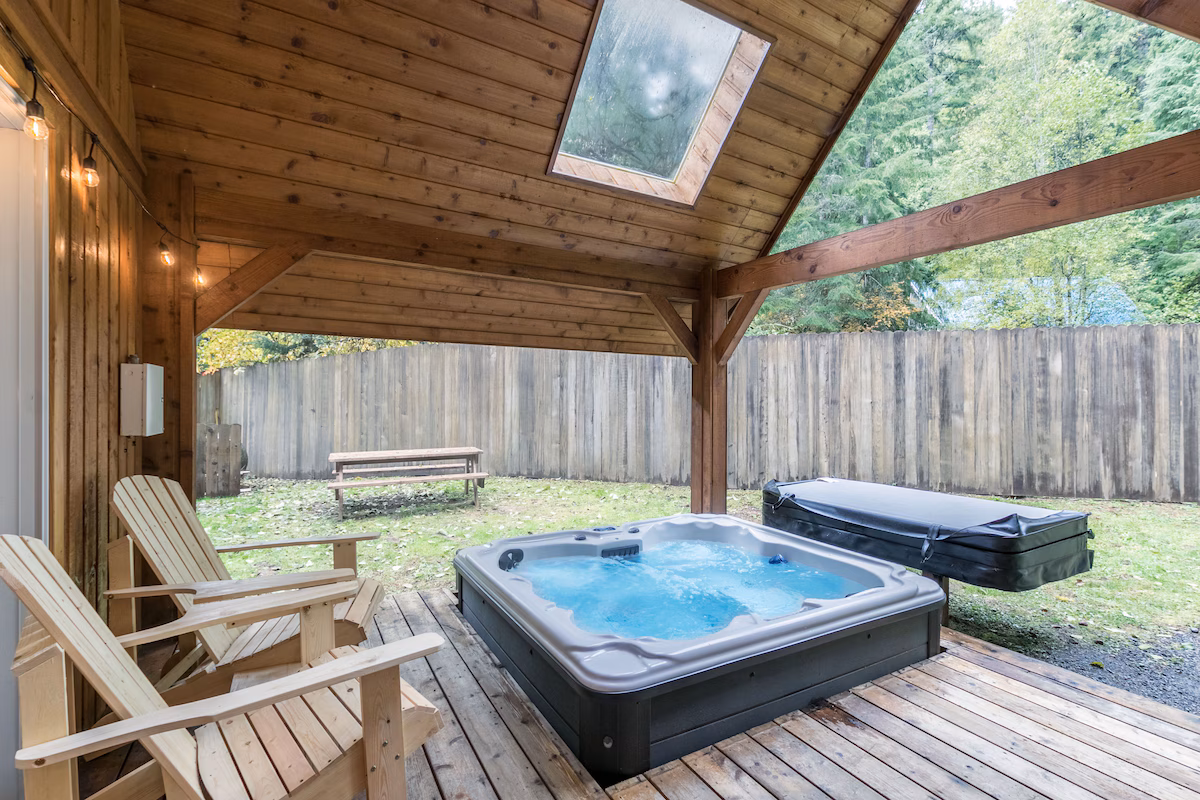 Luxury cabin near Mt. Rainier with covered hot tub, jetted tub, fire pit, full kitchen, AC, EV charger, and scenic deck.