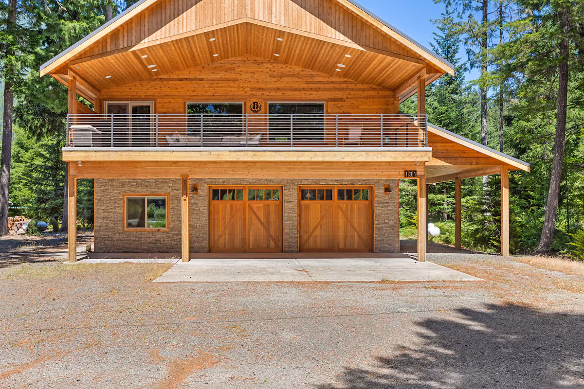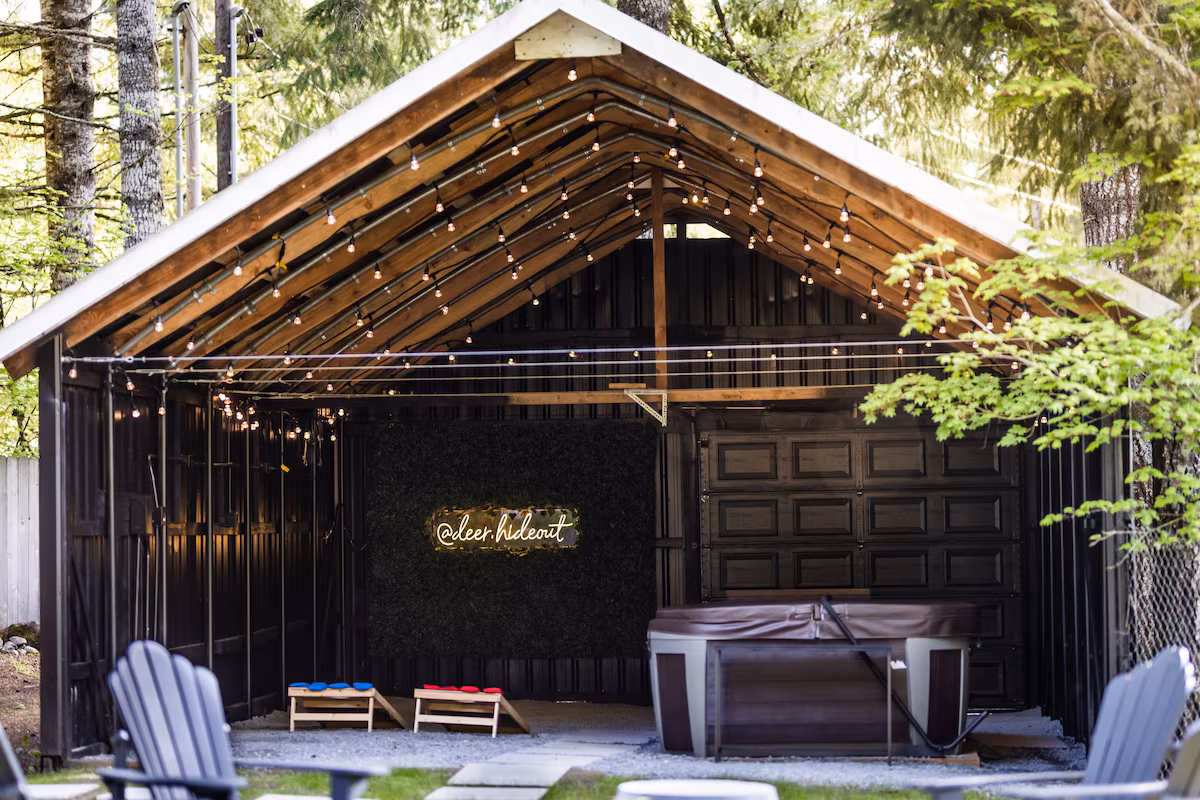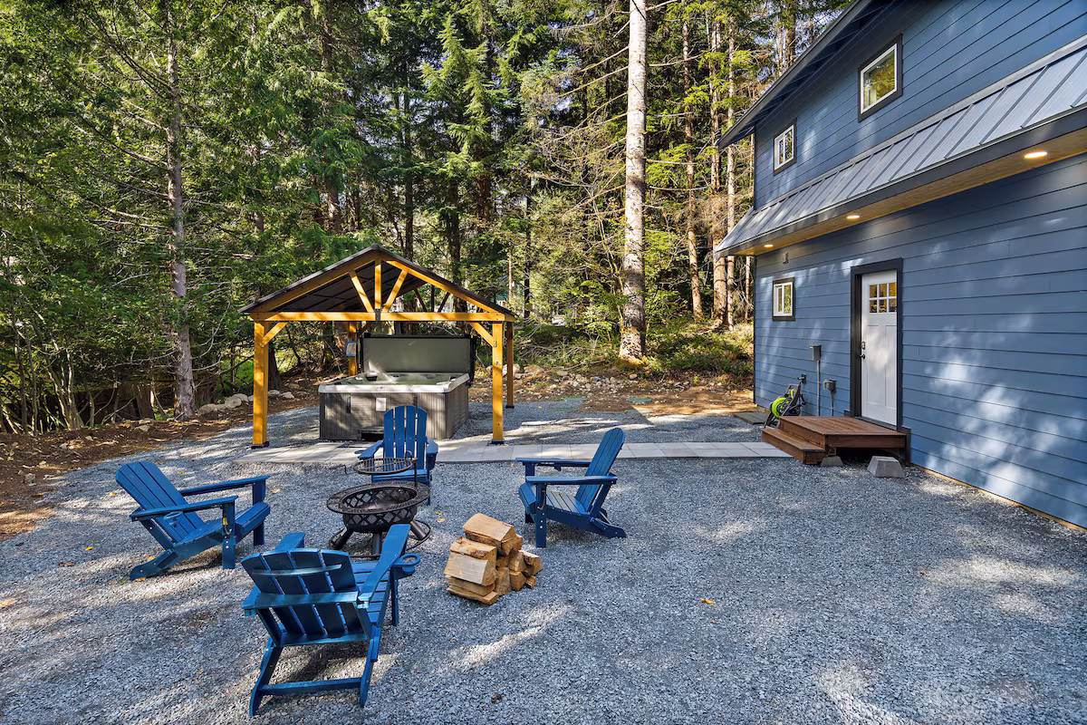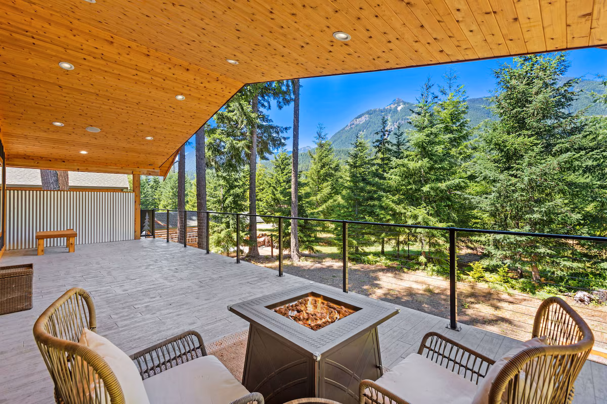 Luxury cabin near Mt. Rainier with covered hot tub, jetted tub, fire pit, full kitchen, AC, EV charger, and scenic deck.