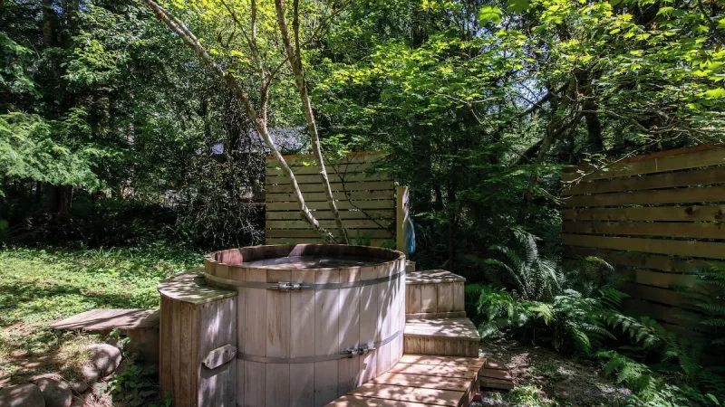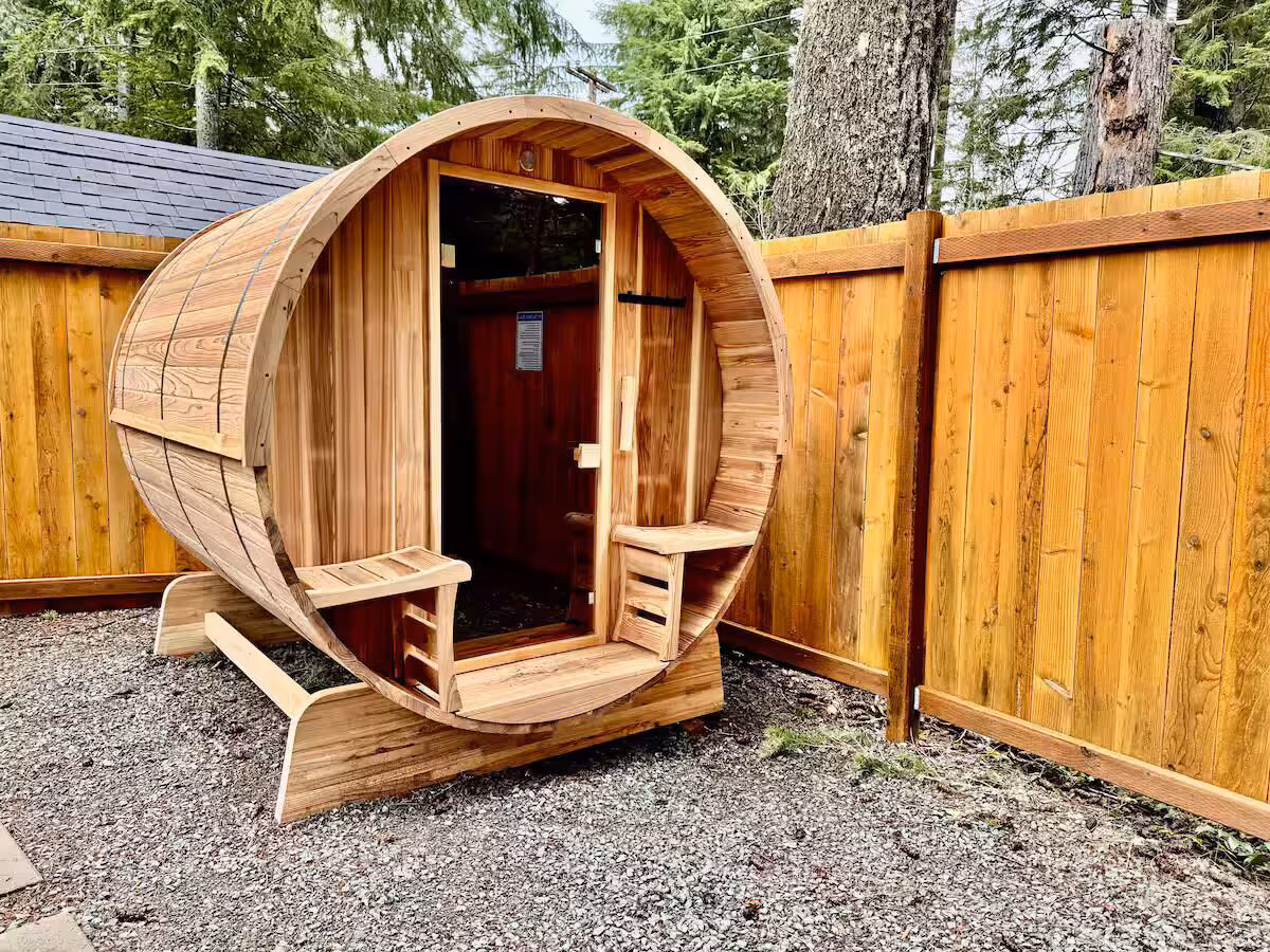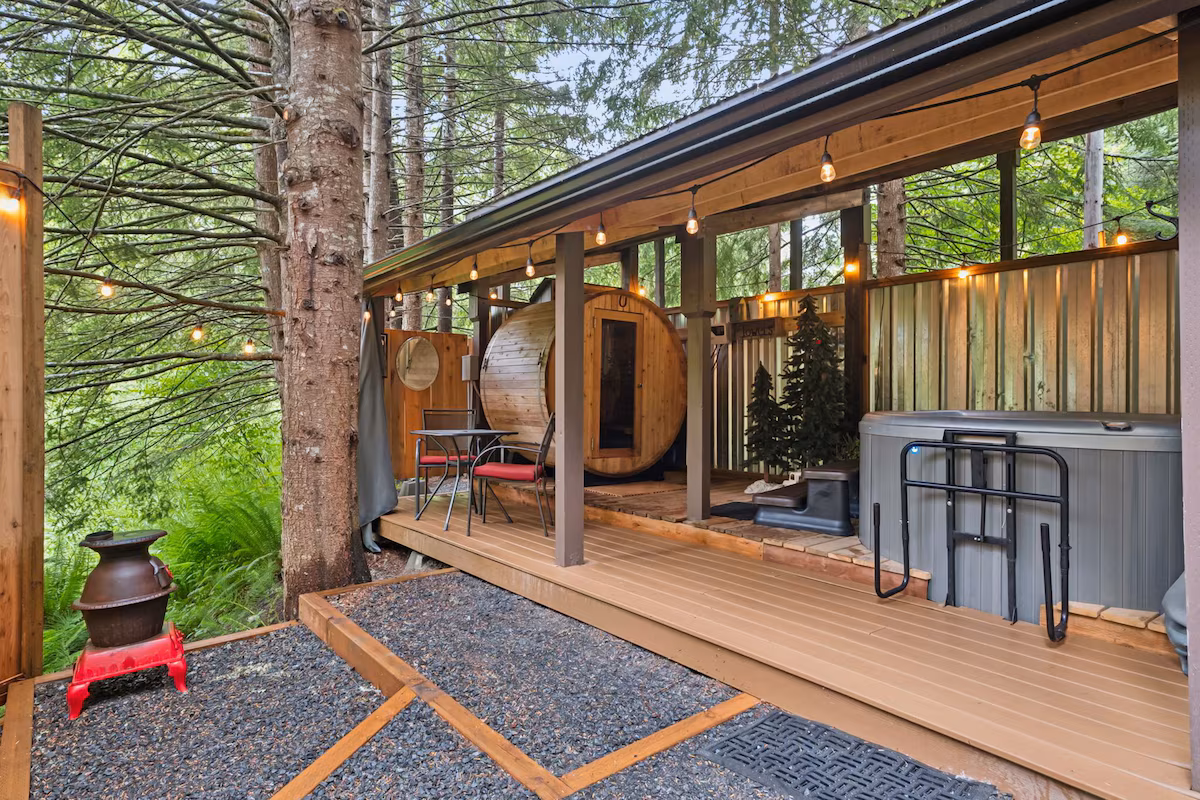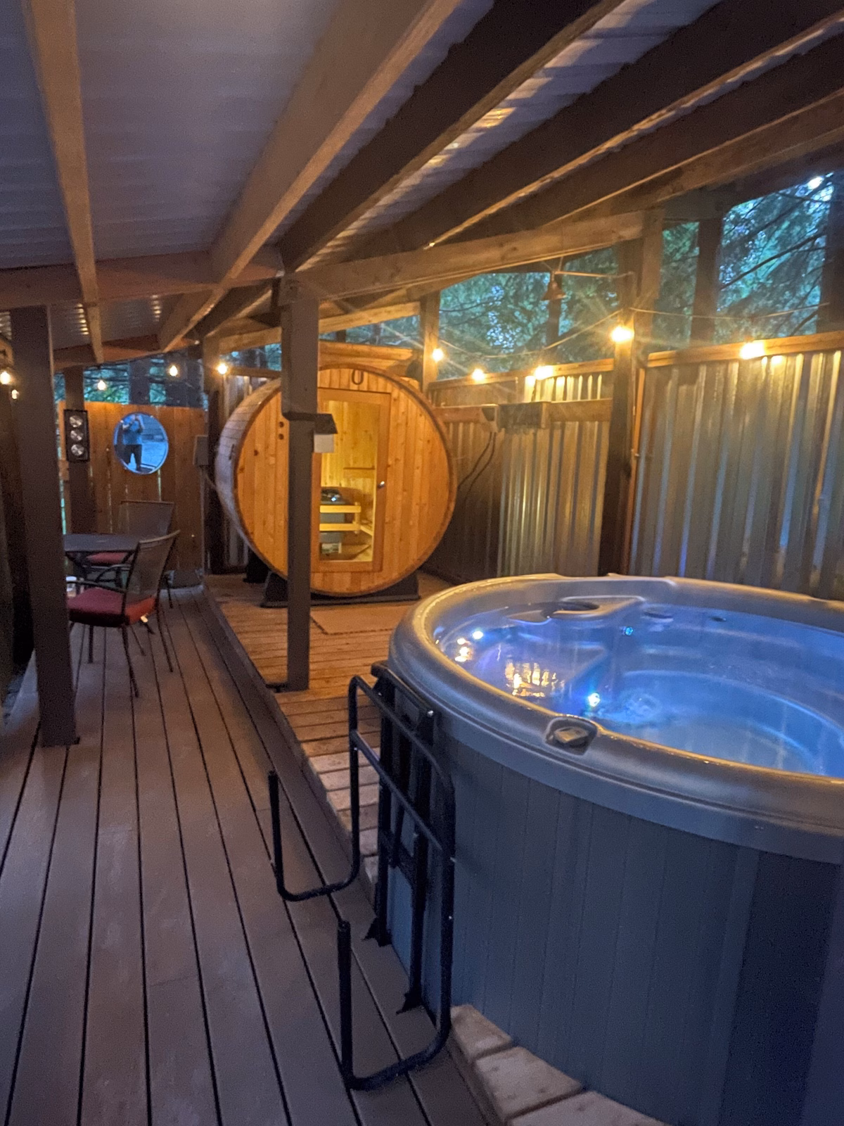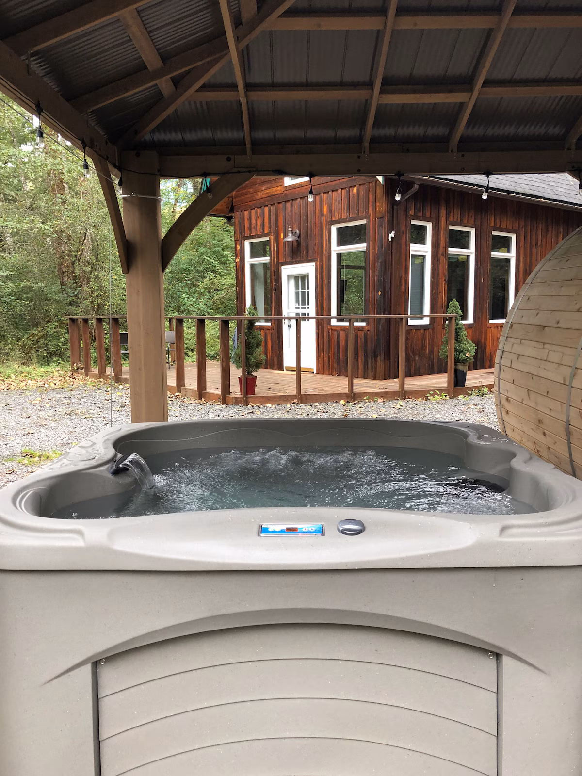 Romantic nature cabin with hot tub, cedar sauna, heated floors, full kitchen, and EV charger, perfect for couples seeking a rustic escape.