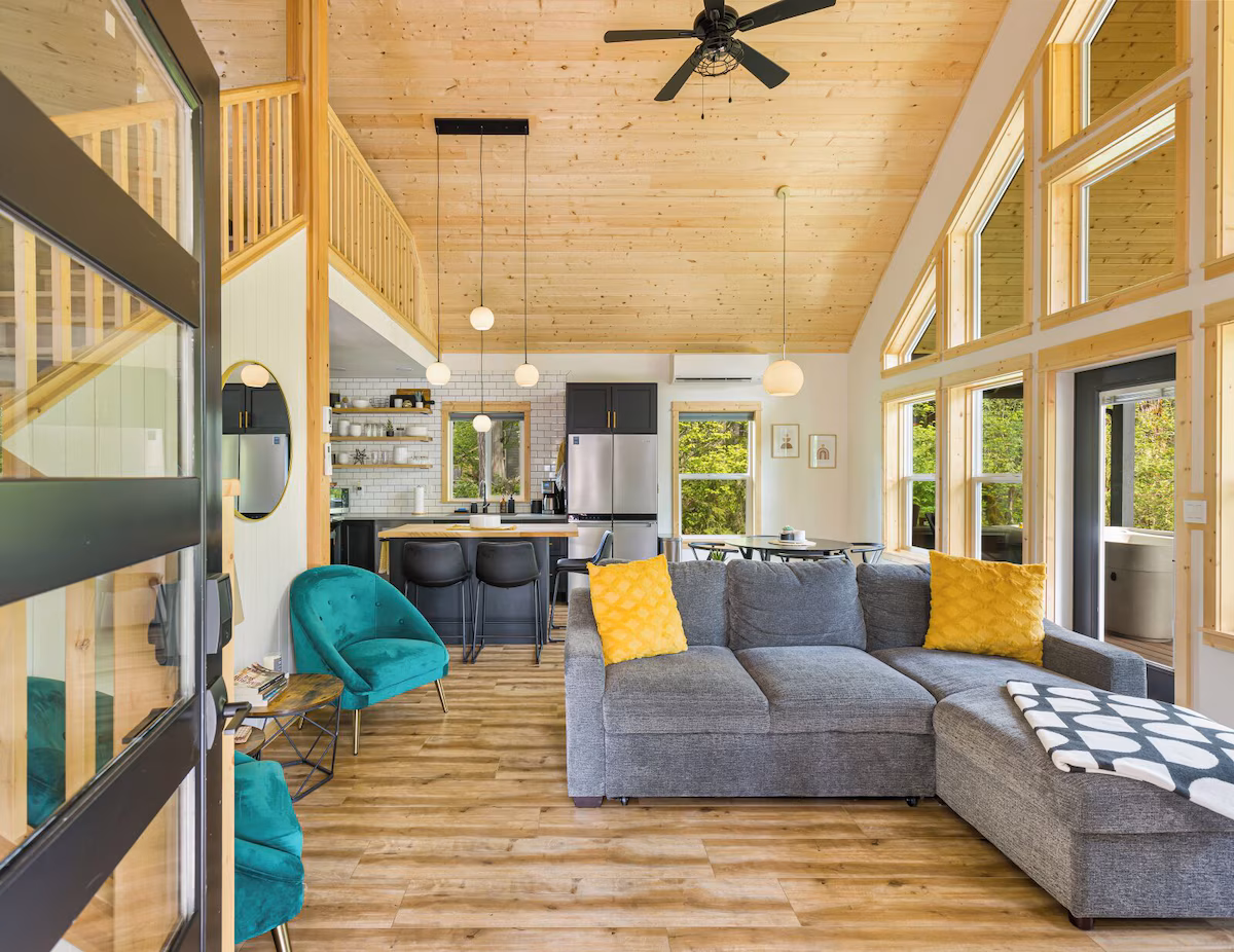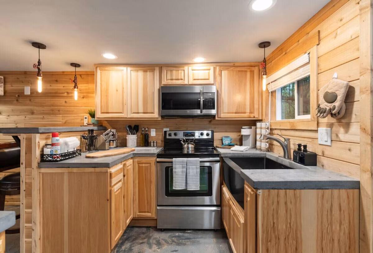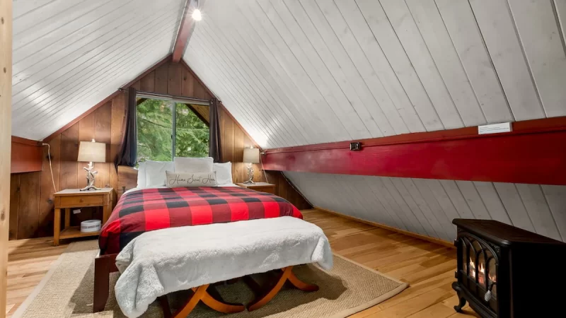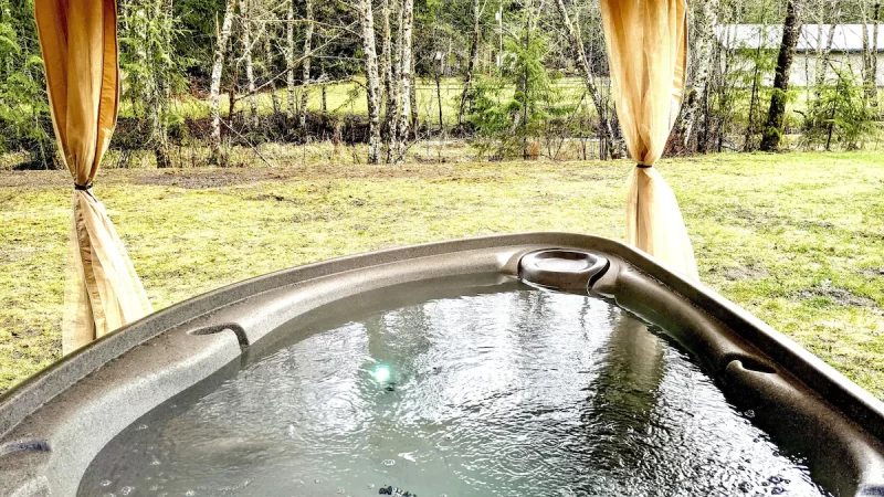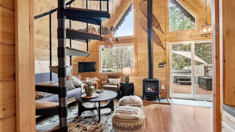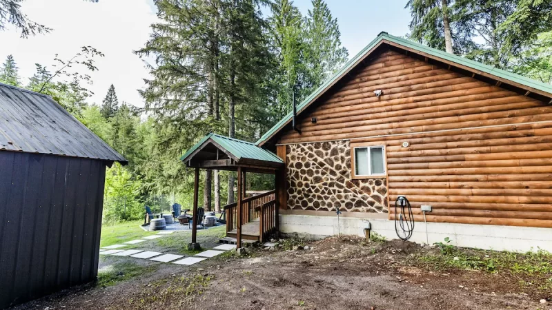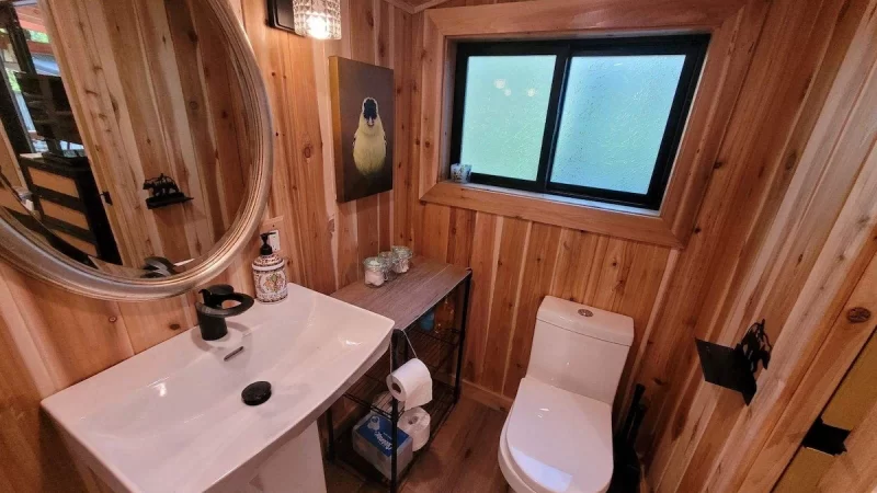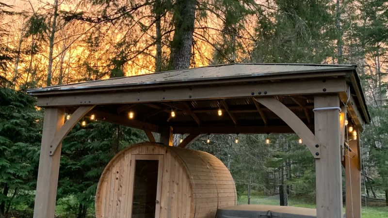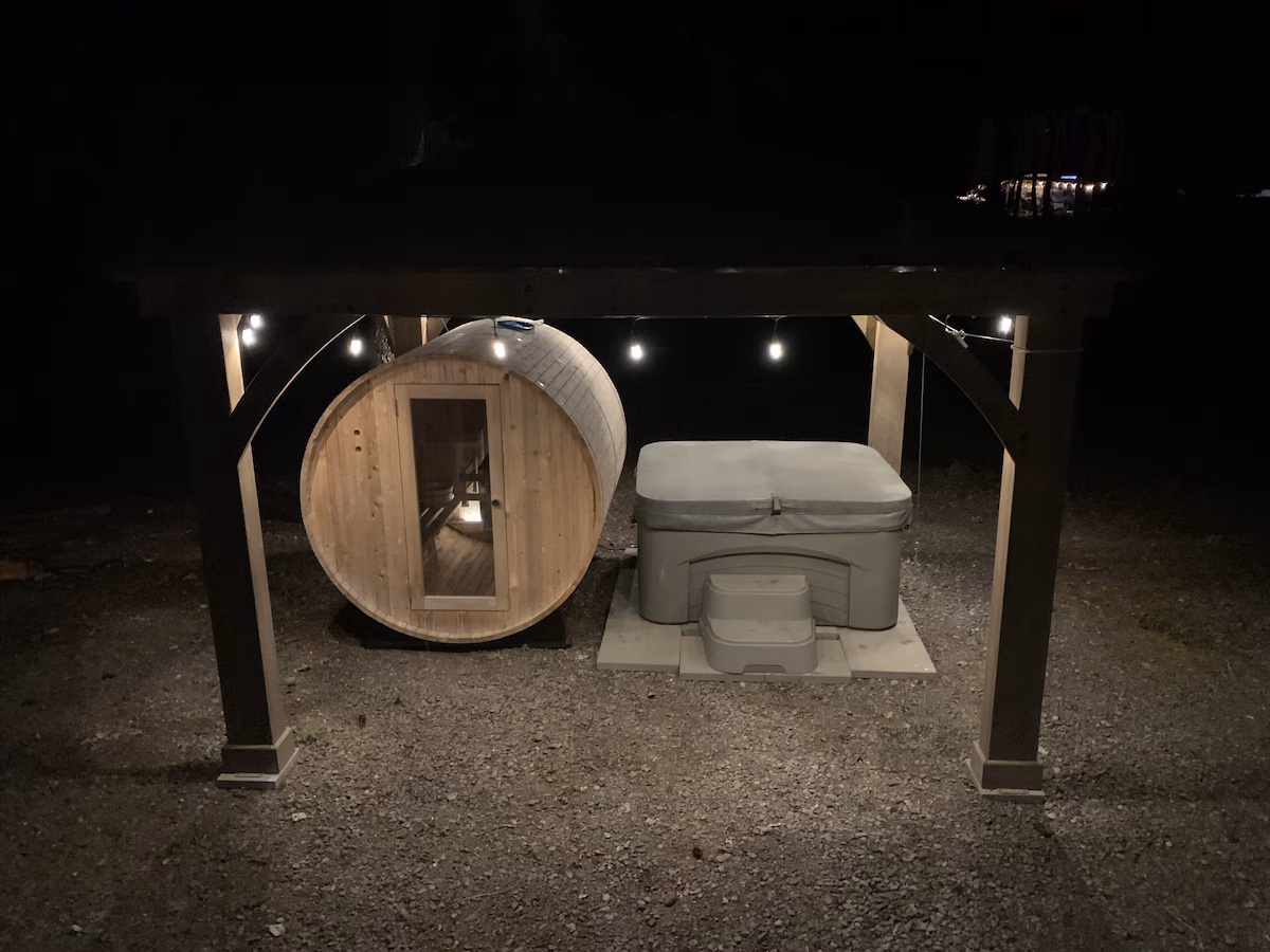 Romantic nature cabin with hot tub, cedar sauna, heated floors, full kitchen, and EV charger, perfect for couples seeking a rustic escape.