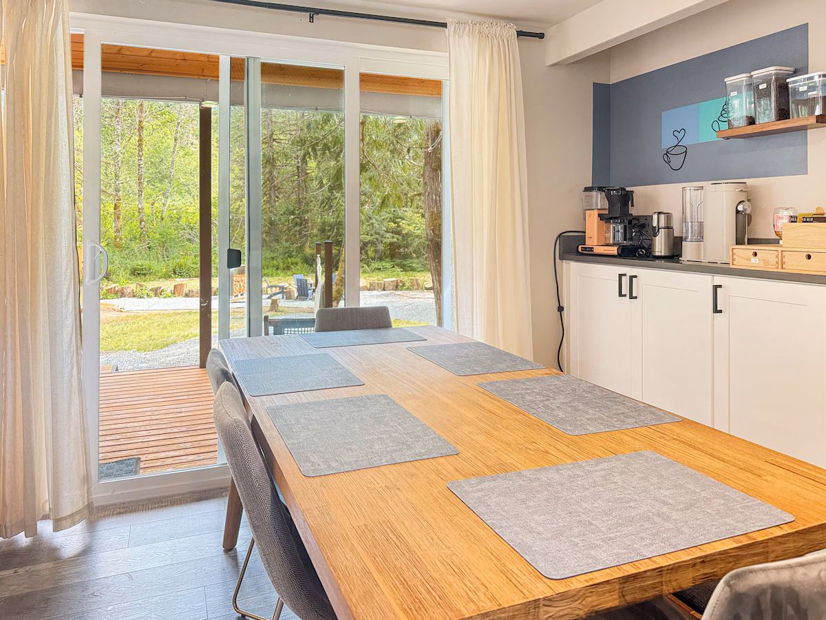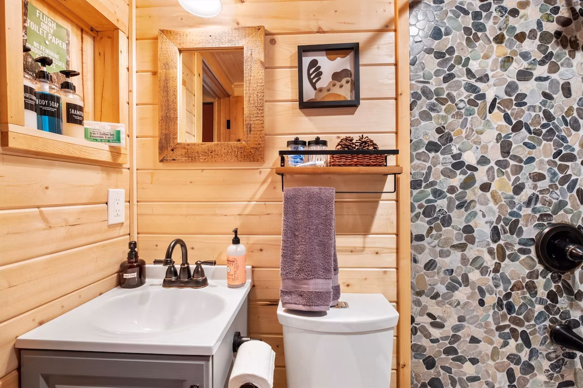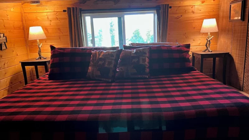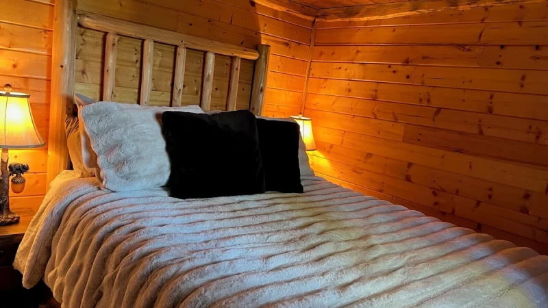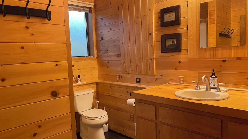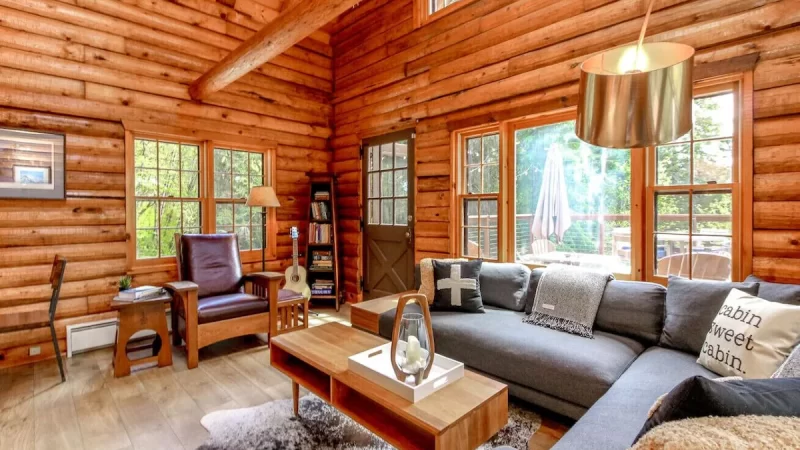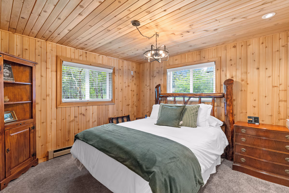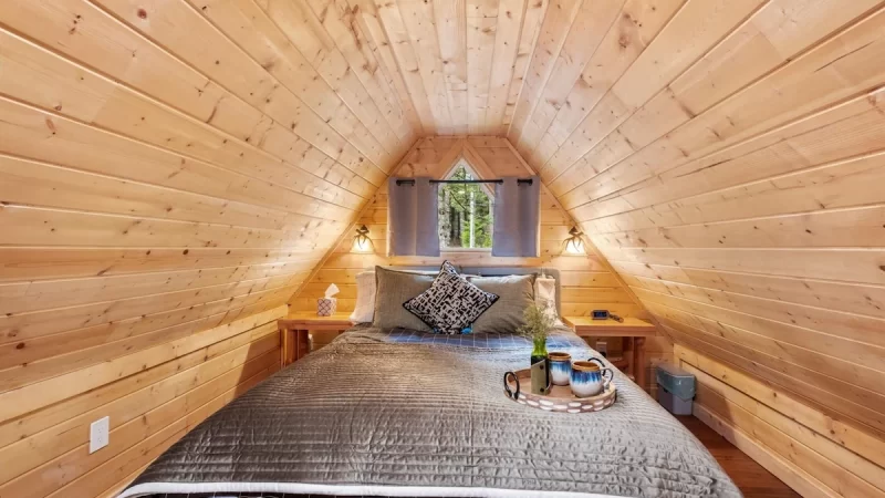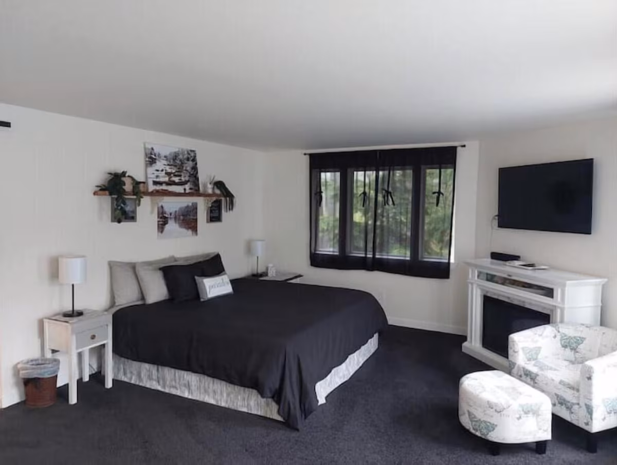 Romantic nature cabin with hot tub, cedar sauna, heated floors, full kitchen, and EV charger, perfect for couples seeking a rustic escape.