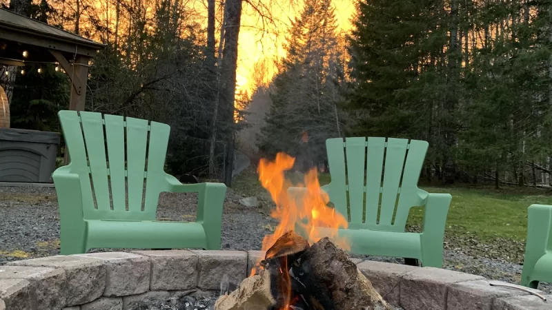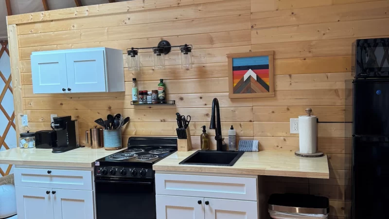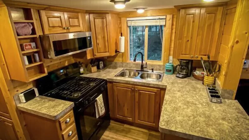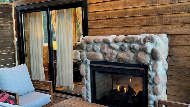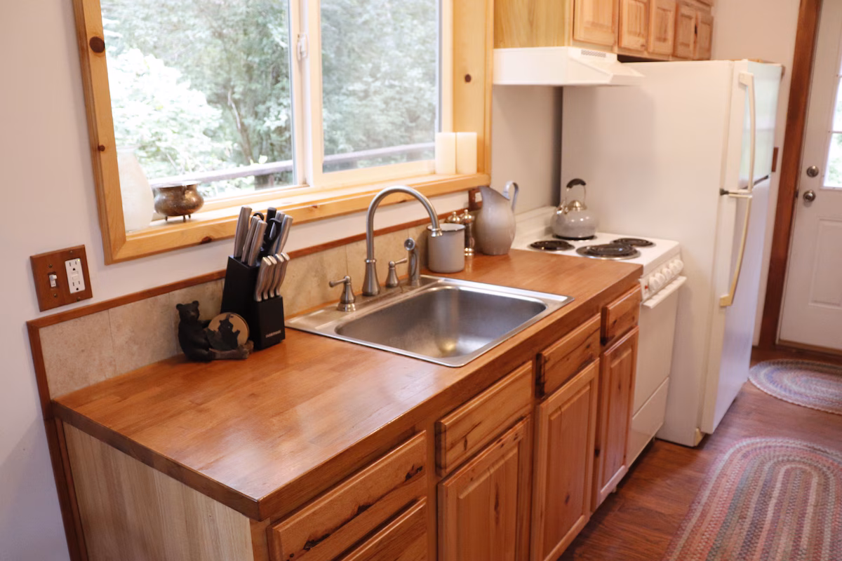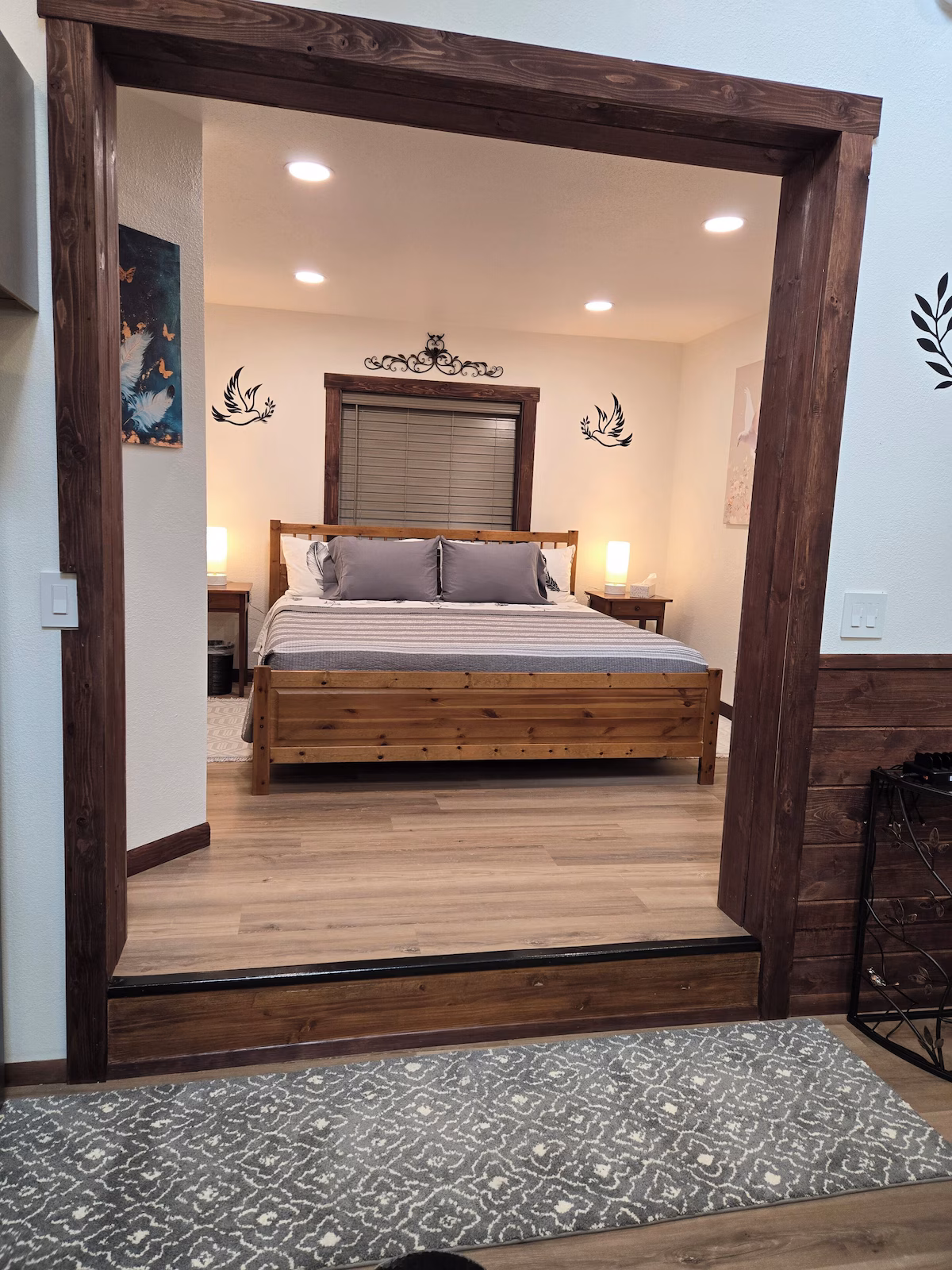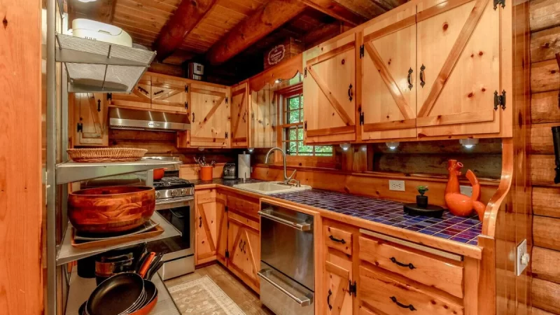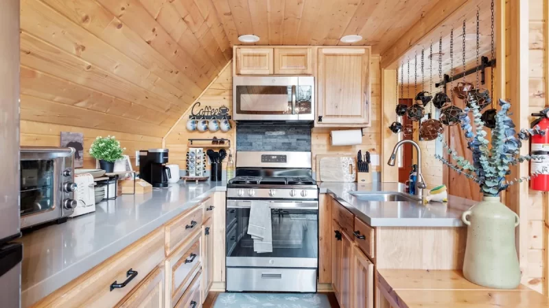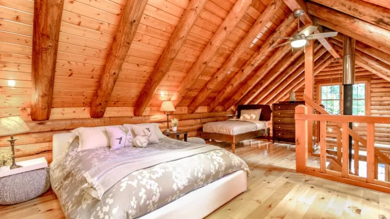Romantic nature cabin with hot tub, cedar sauna, heated floors, full kitchen, and EV charger, perfect for couples seeking a rustic escape.