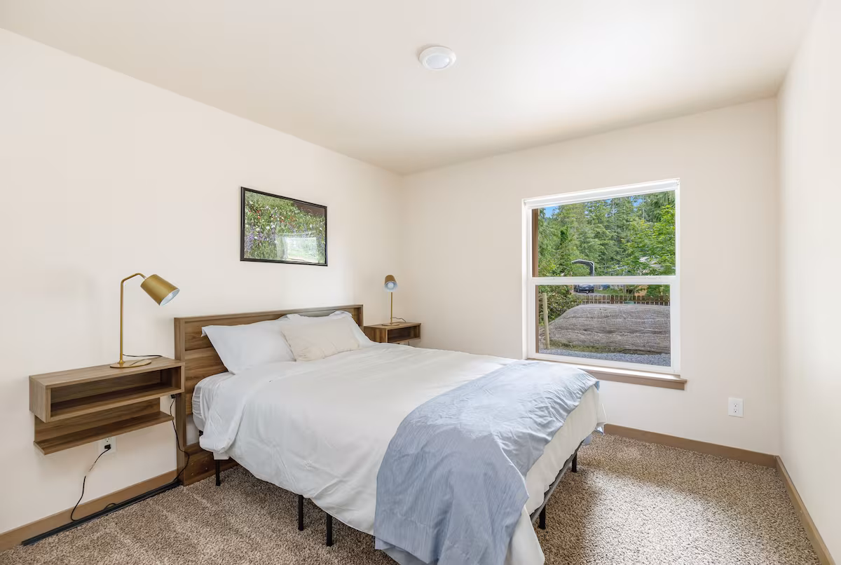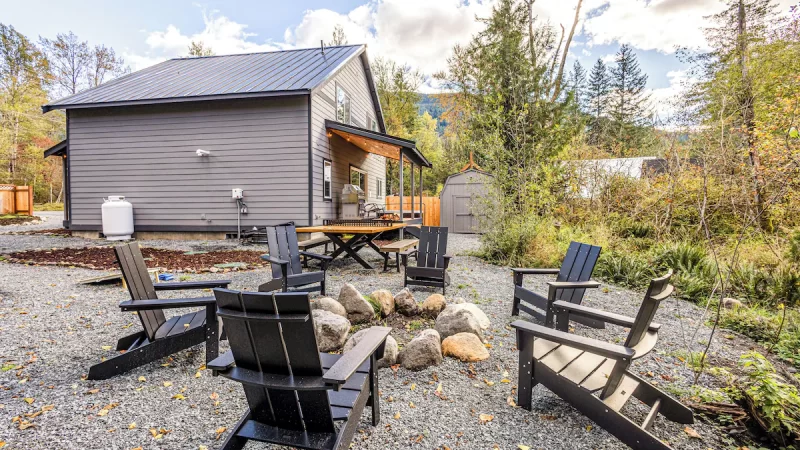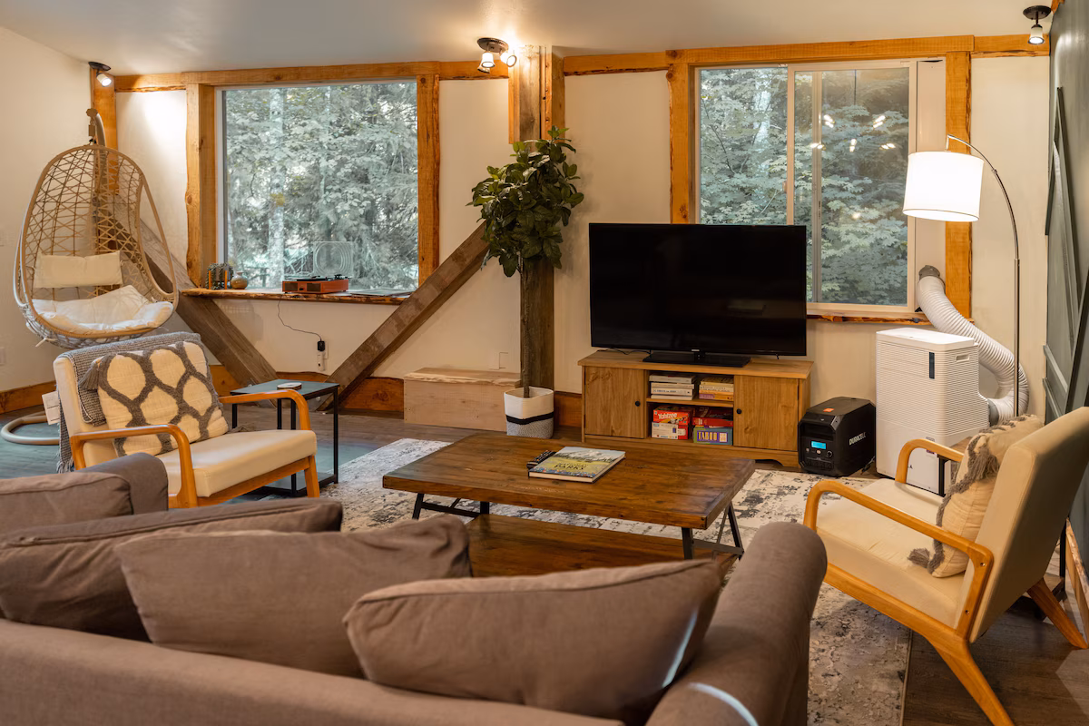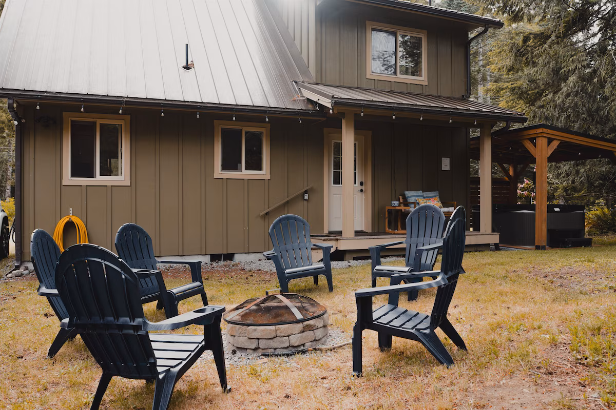 Modern 2-bedroom forest cabin with hot tub, fire pit, full kitchen, and fast Wi-Fi, just 7 minutes from Mt. Rainier National Park.