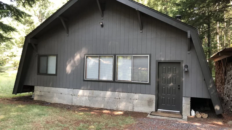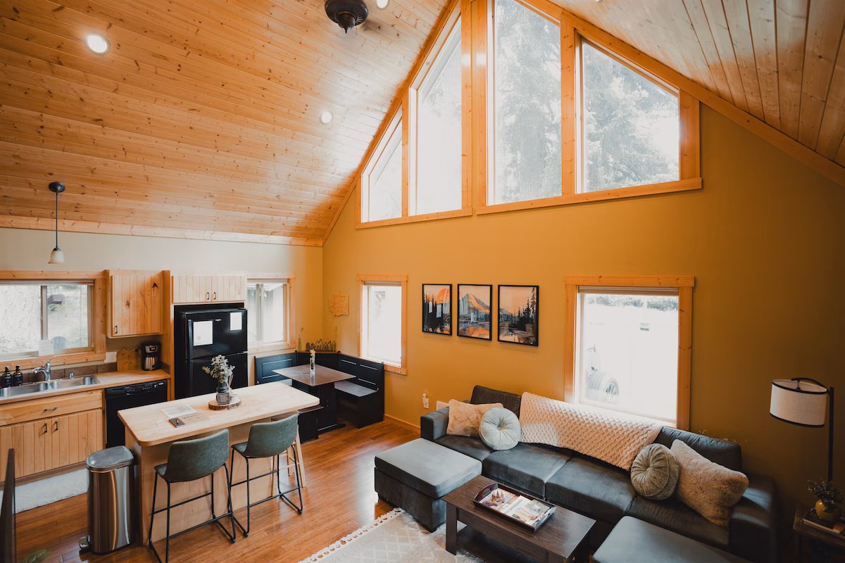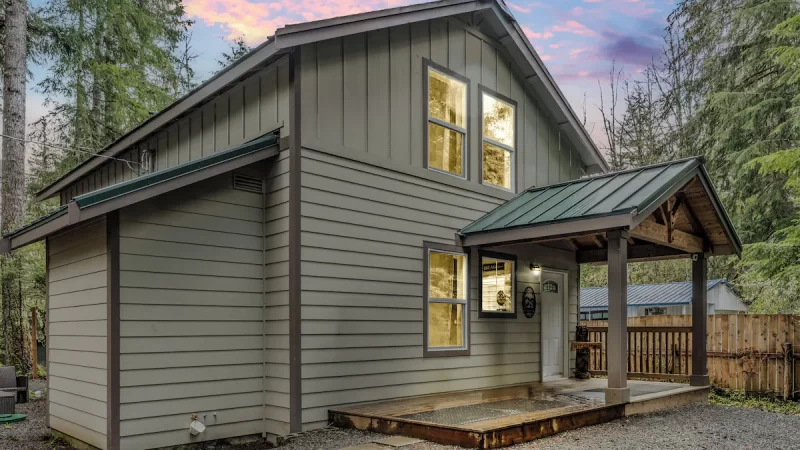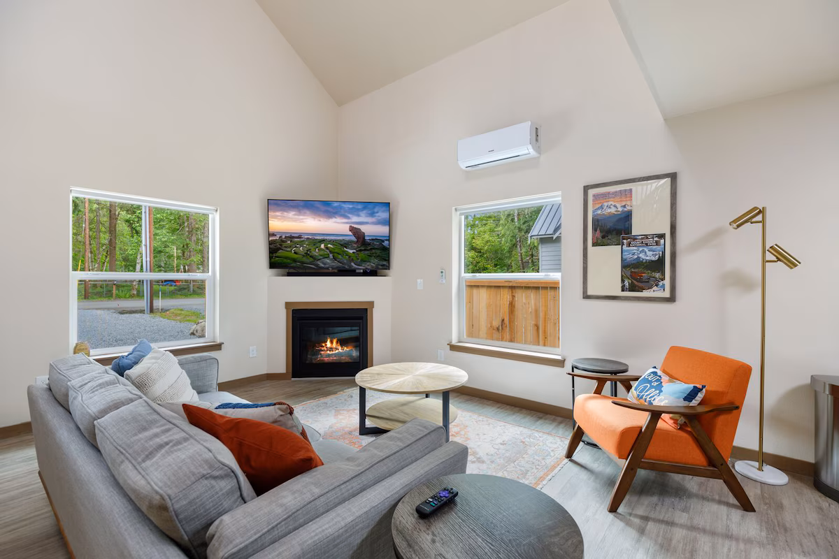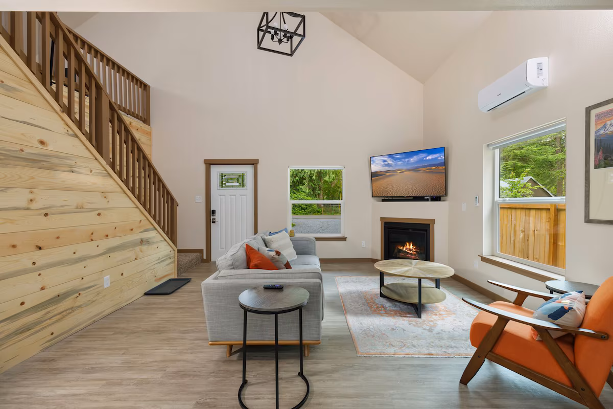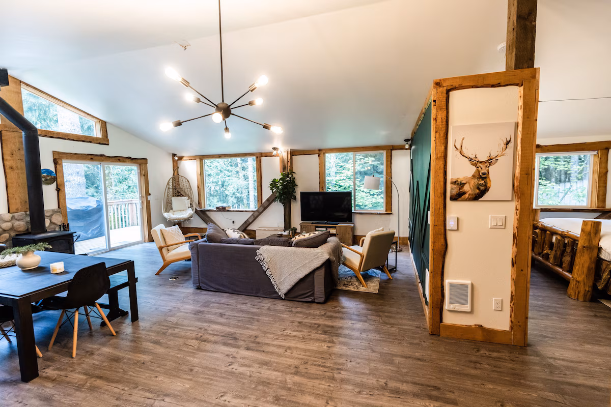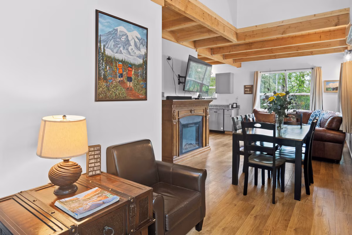 2-bedroom cabin with hot tub and modern amenities near Mt. Rainier, ideal for year-round adventures from hiking Skyline Trail to skiing Crystal Mountain.