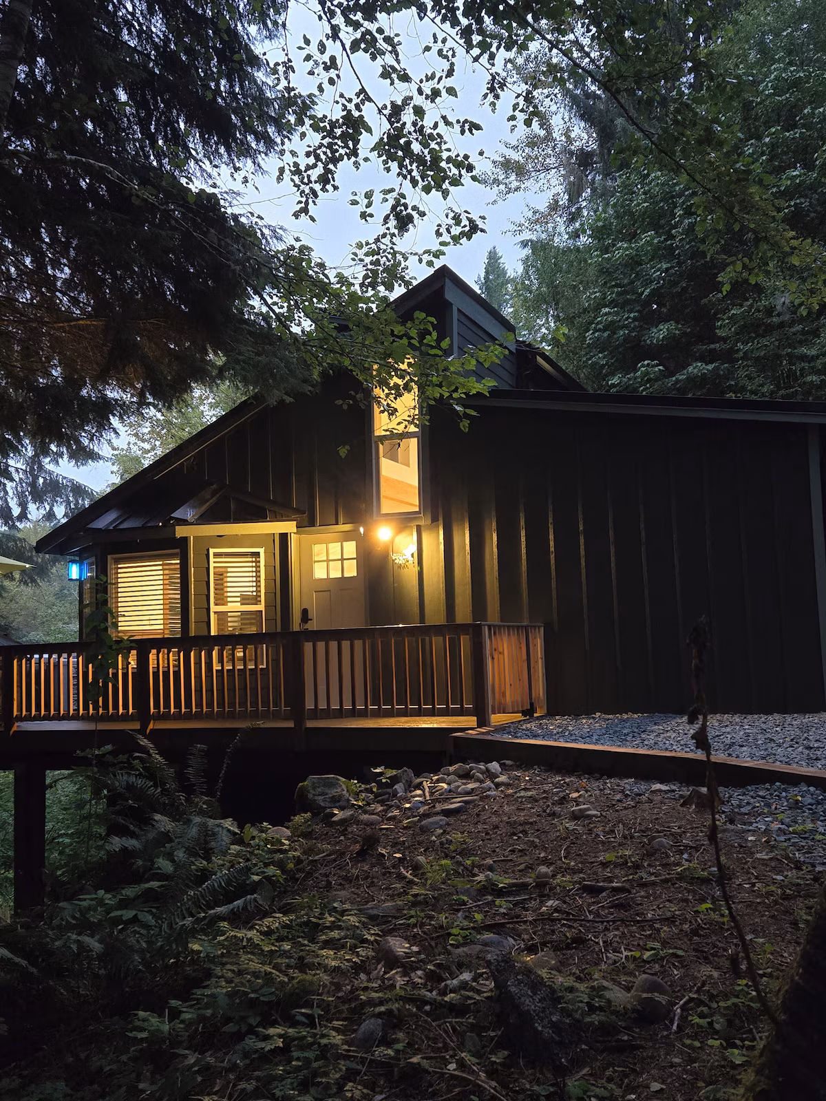 Secluded cabin with private hot tub, fire pit, full kitchen, EV charger, Wi-Fi, and forest views, just outside Mt. Rainier National Park.