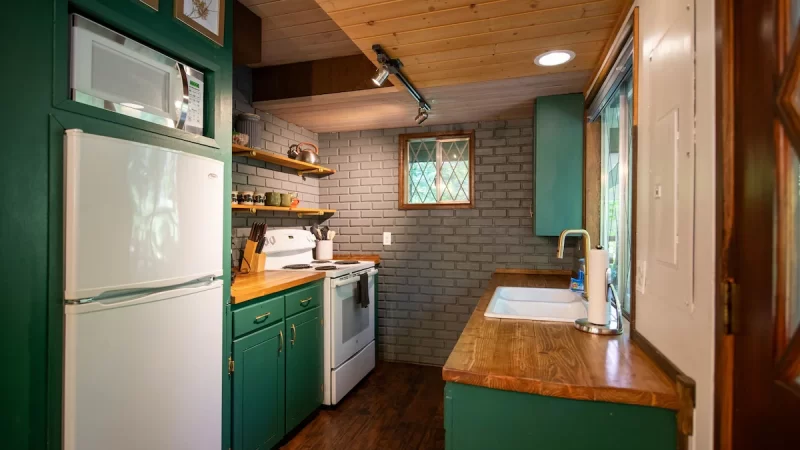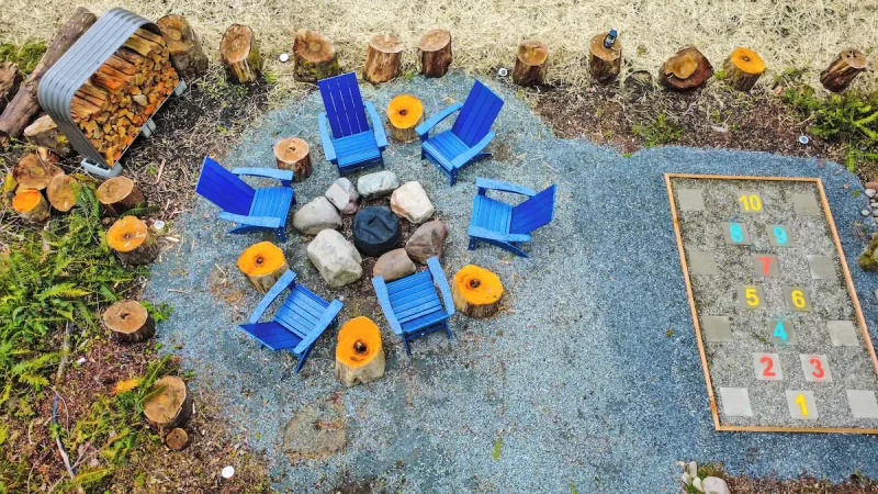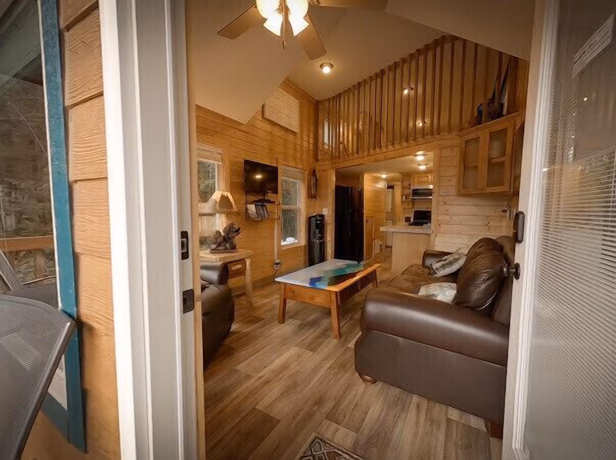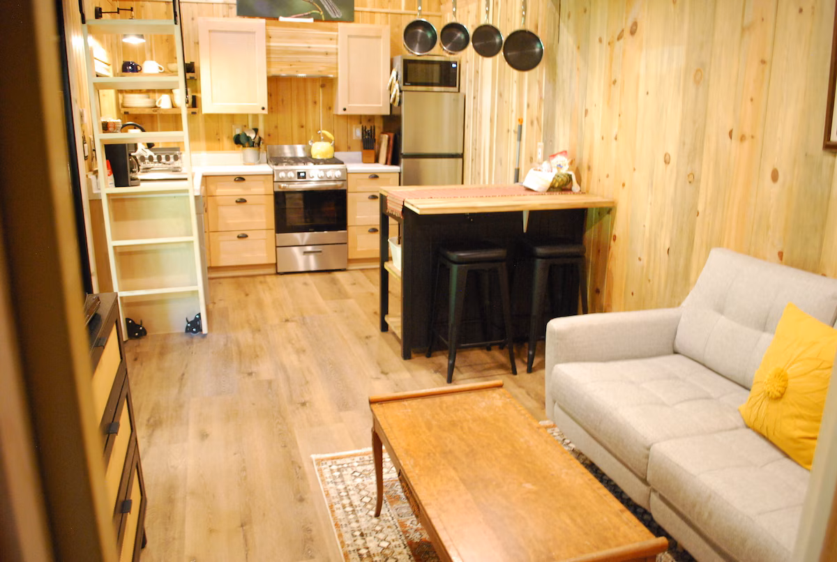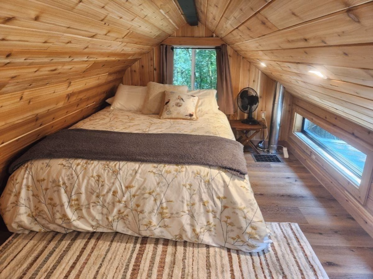 Riverside tiny house with hot tub, fire pit, loft king bed, full kitchen, Wi-Fi, propane BBQ, near scenic views.