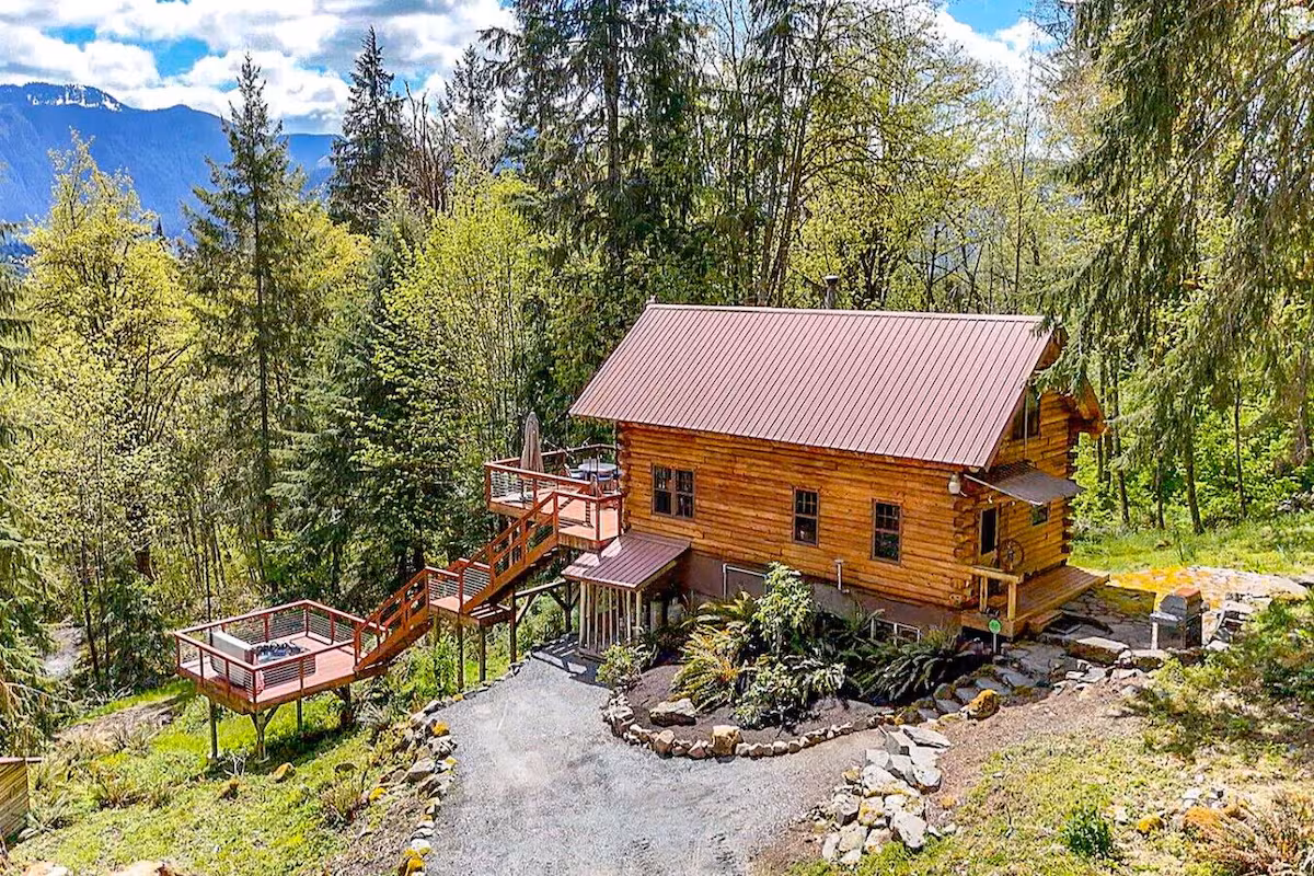 Private forest cabin on 9 acres with full kitchen, ping pong, hot tub, coffee bar, and scenic decks, less than 5 miles from Mt. Rainier.