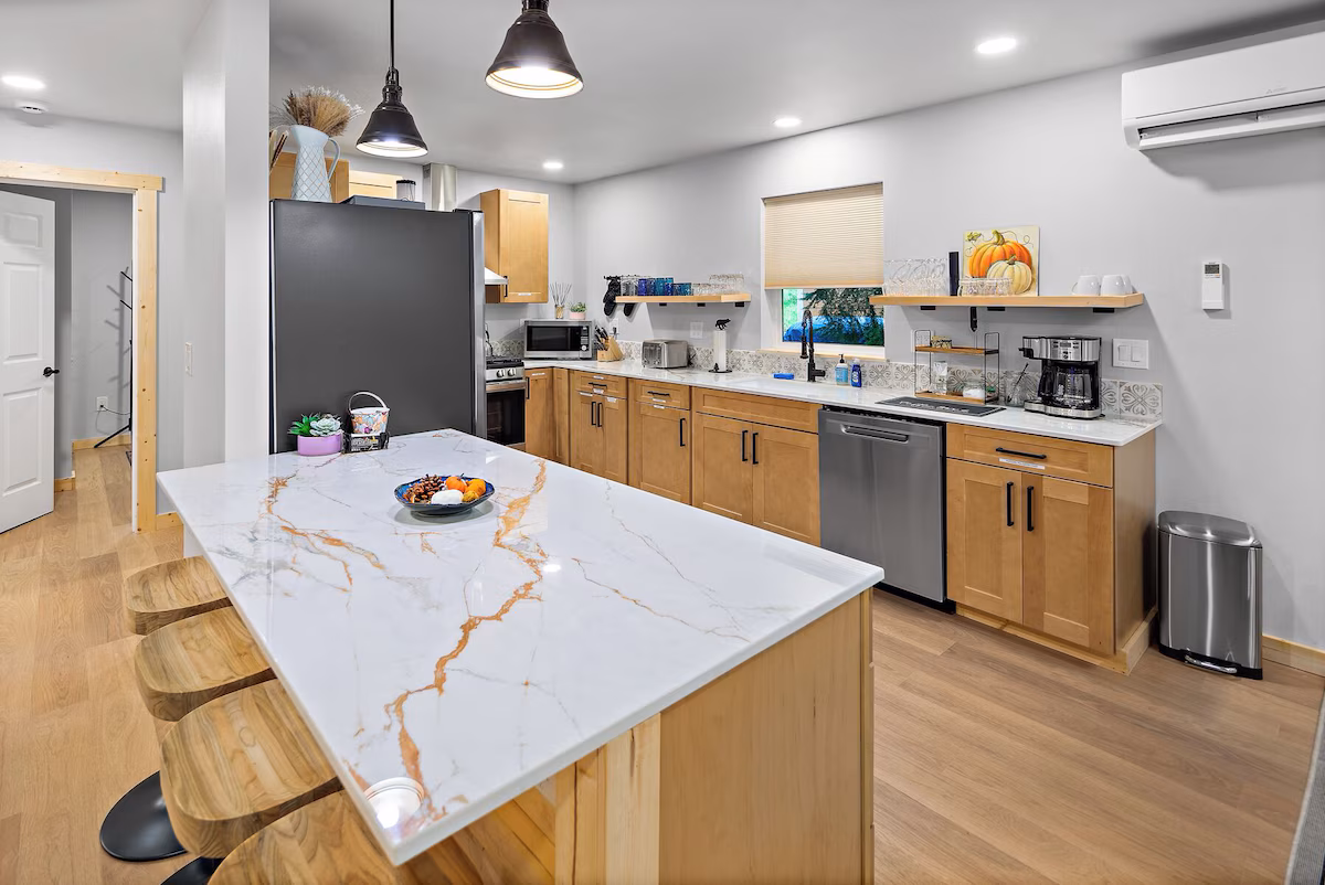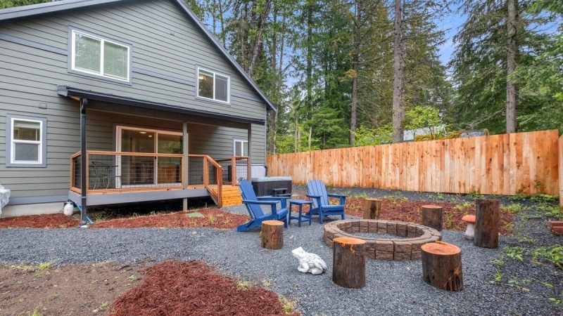 Spacious 3-bedroom home with fire pit, BBQ, modern comforts, and hot tub just 8 minutes from Mt. Rainier National Park’s entrance.