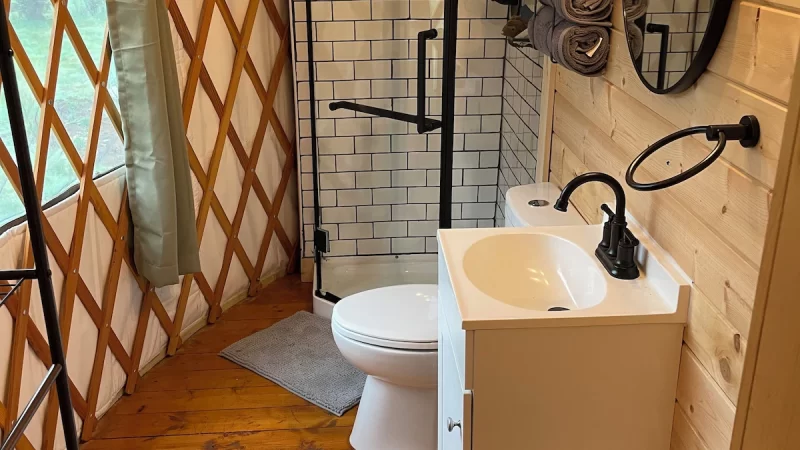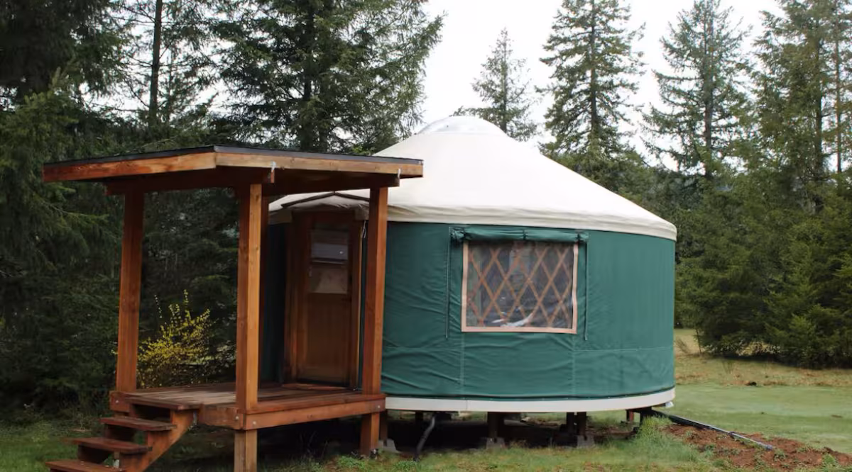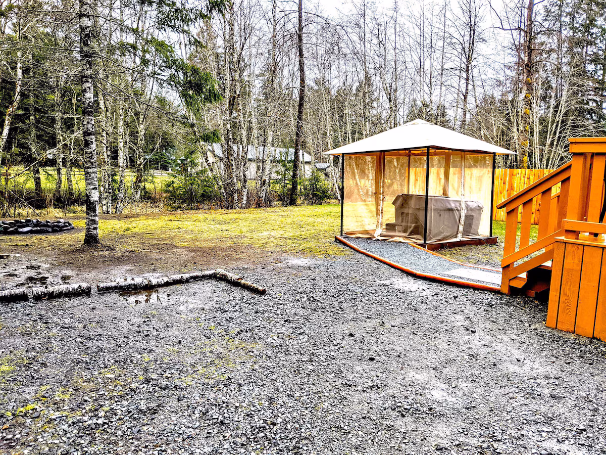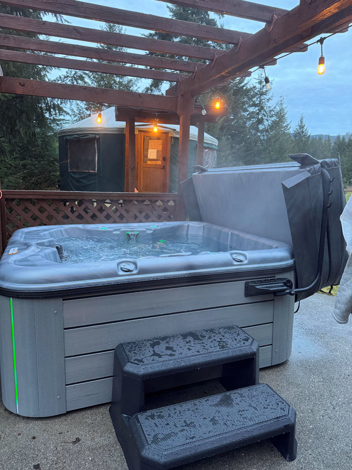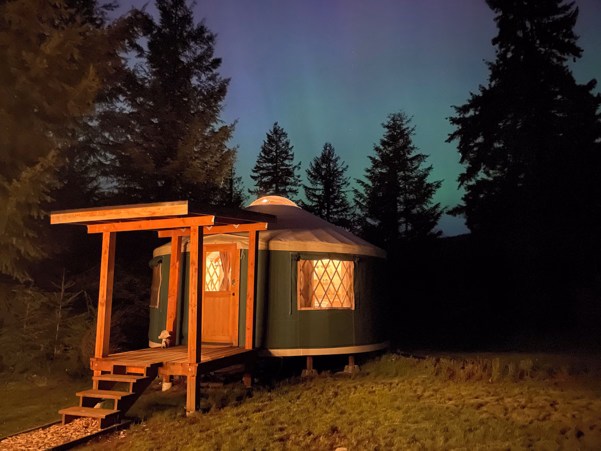Cozy 20′ Pacific yurt with open field stargazing, clear dome roof, outdoor hot tub, and nature views, less than 10 minutes from Mt. Rainier’s entrance.