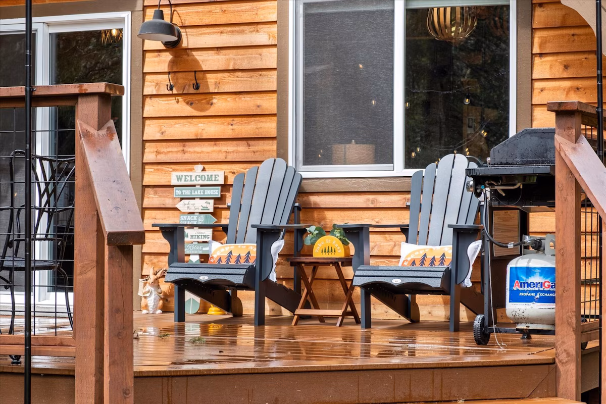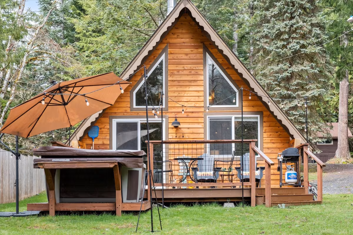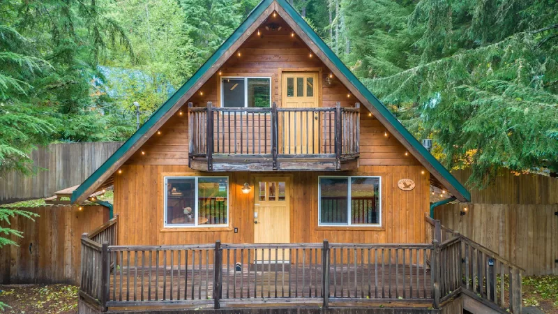 Stylish A-frame cabin with year-round hot tub, full kitchen, fire pit, balcony views, just 8 minutes from Mt. Rainier National Park.