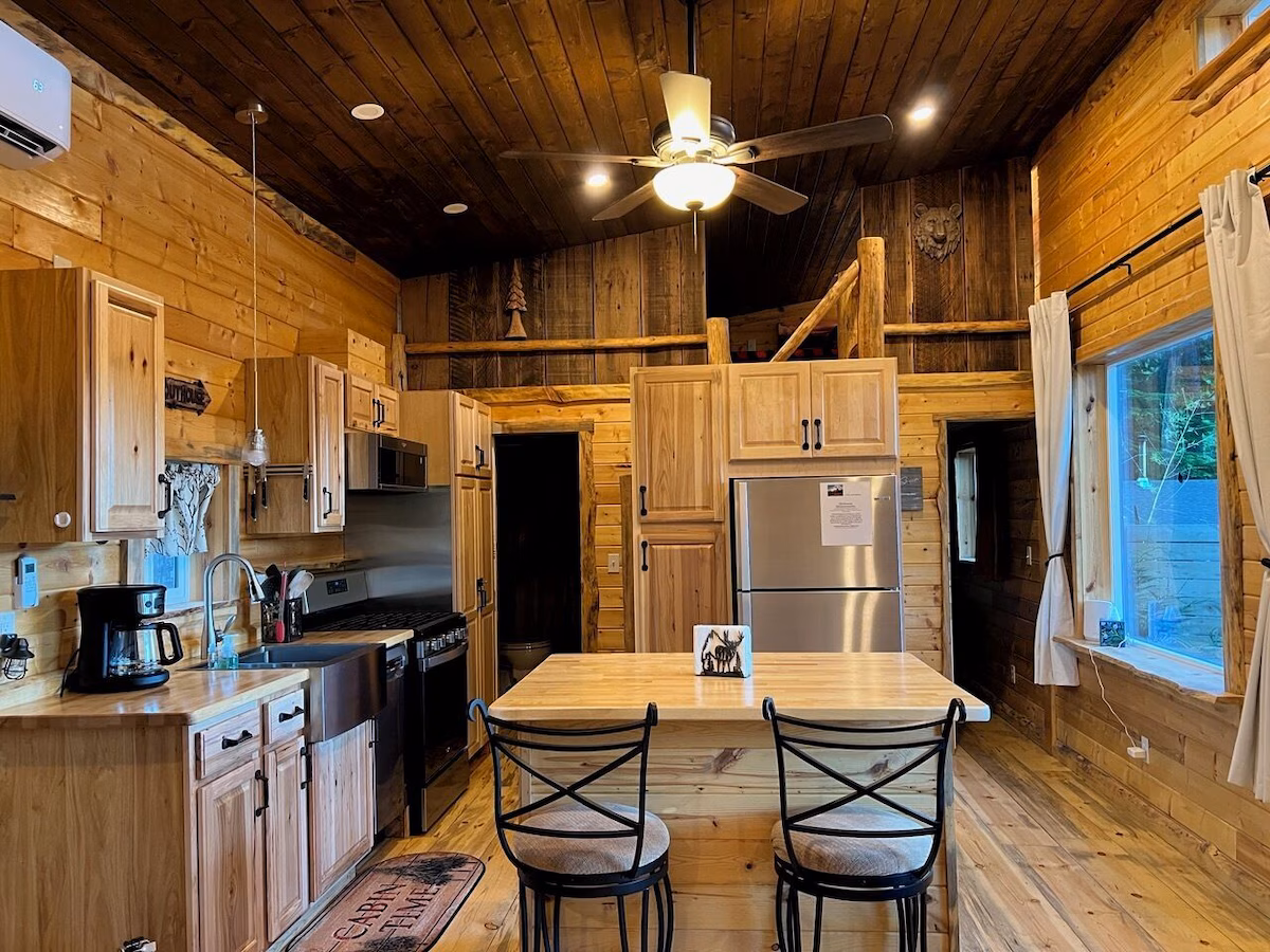 Tiny log cabin with private hot tub, full kitchen, fireplace, smart TV, lake access, and patio BBQ, located in Paradise Estates near Ashford.