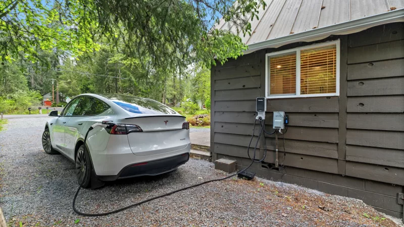 Private cabin with covered hot tub, firepit, full kitchen, A/C, EV charger, and deck, just 5 miles from Mt. Rainier National Park.