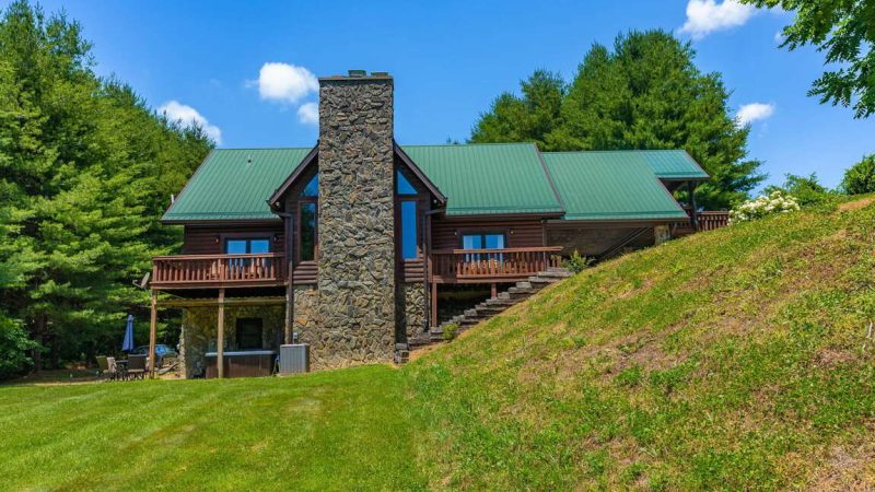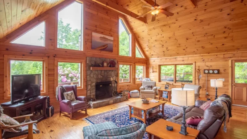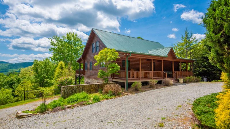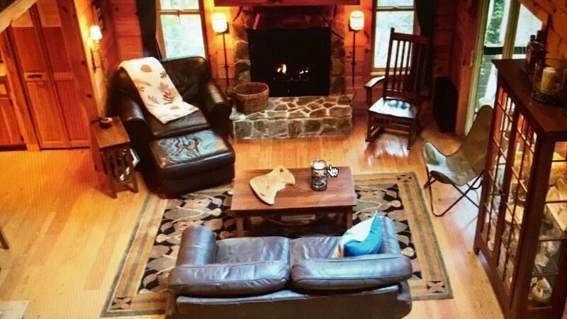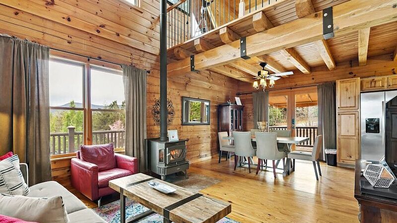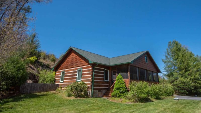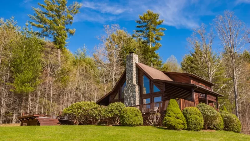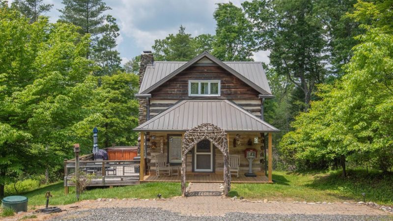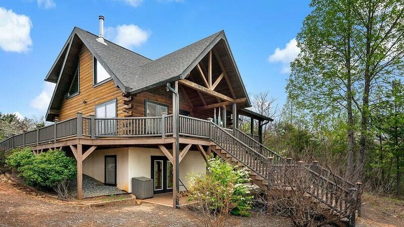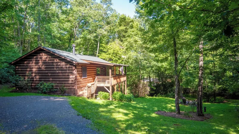 Rustic log cabin with a hot tub, spacious interiors, and nature-filled surroundings in North Carolina.