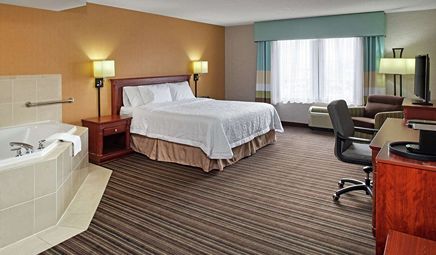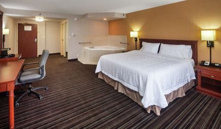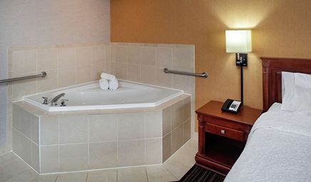The best affordable hotel with Jacuzzi in room in Toronto is Hampton Inn & Suites by Hilton Toronto Airport. You can take a look at our full list of best affordable hotels with hot tub suites in Toronto.