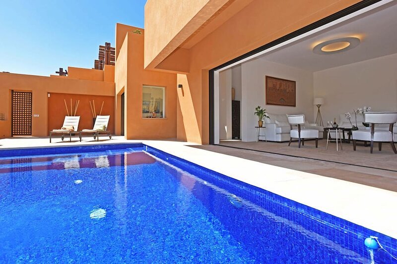 Complejo sostenible con villas y apartamentos con piscina privada, cocina y autobús gratuito a la playa, ubicado en Tenerife.