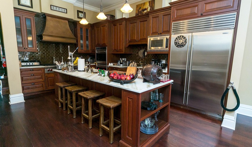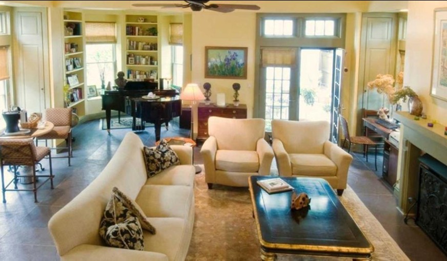 La cerradura inteligente en la puerta de entrada te permite entrar silenciosamente (suponiendo que sepas tu código) y la hermosa decoración te da la bienvenida adentro. El comedor tiene capacidad para muchos y la cocina y la sala de estar baja, luciendo un piano de media cola blanco brillante, impresionan de inmediato.