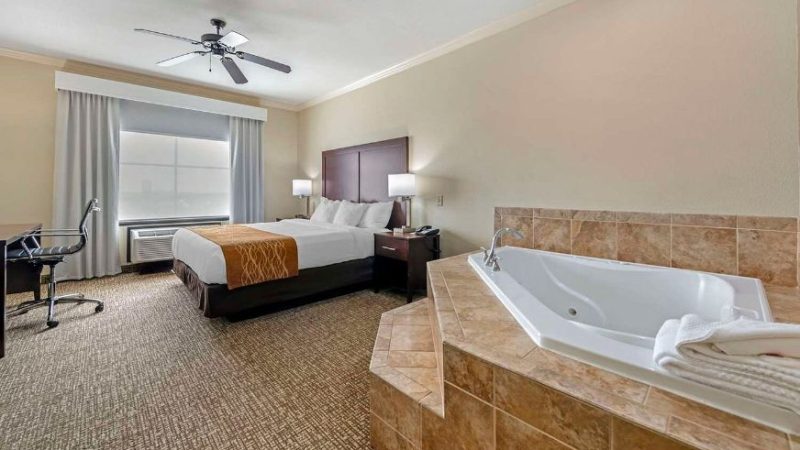 The best affordable hotel with whirlpool suites in Fort Worth is Comfort Inn & Suites Fort Worth – Fossil Creek. You can see our full list of best budget-friendly hotels with hot tub in room in Fort Worth.